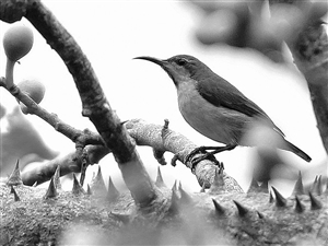 □王家凯/文图 2018年10月4日,乘坐游览车进入中国科学院西双版纳热带植物园。过了罗梭江大桥,只见左边绿树丛中,一片粉红色的花朵特别耀眼。几年拍摄鸟类的经历告诉我,鲜花盛开的地方往往是小鸟最多的地方,也是最容易拍摄到小鸟照片的地方。游过了园内的主要景点后,我特意步行出园,去看一看那一片耀眼的粉红。 到了树旁,我一眼便认出这是一棵美丽异木棉,树下,一位年轻朋友正专注地拍摄树上的小鸟。我通过长焦镜头观看,花间的小鸟十分机灵,着装主要是两个色调:背部橄榄绿色,腹部桔黄色;黑色的嘴弯弯的、尖尖的,显得有些长;尾巴小小的短短的;黑色的眼睛上下镶嵌着浅黄色的眉纹。它们三五成群在粉红色的花朵间跳来跳去,啾啾地哼着有韵律的歌,追逐、打闹、嬉戏,显得十分快乐。 这种小鸟是太阳鸟科、花蜜鸟属的黄腹花蜜鸟。因为已经过了繁殖期,它们在花间的追逐、打闹、嬉戏,并非异性间的谈情说爱,纯粹是雄鸟间的娱乐,就像乡间的那些小男孩躲猫猫、做游戏一样。此时的帅哥,已经脱去了谈婚论嫁时的华丽服装,与专注地吸食花蜜的女郎着装大体相同,但依然可以区分,它的喉部有一条狭窄的黑色条纹。恋爱时,它的下巴颏及胸部闪耀着黑紫色的金属光泽,并系有一条绯红及灰色的胸带,由橙黄色丝质羽毛形成的肩斑也十分醒目。 美丽异木棉为落叶乔木,原产南美洲,与我国南方常见的木棉同为木棉科植物。两种植物开花时满树均绚丽耀眼,不同的是,木棉春天开花,美丽异木棉却是秋、冬季节开花;木棉是先开花后长叶,美丽异木棉是先落叶后开花;木棉花鲜红,美丽异木棉花色粉红。美丽异木棉还有一个特点,树干和树枝上密生圆锥状的皮刺。有趣的是,木棉在我国被称为“英雄花”,美丽异木棉则有“美人树”的美誉。人类的想象是十分丰富的,“美人树”上的那些皮刺被称为“美人的青春痘”。“英雄”与“美人”,可谓花中绝配。 除了美丽异木棉上能看到黄腹花蜜鸟,芭蕉花、瓷玫瑰等花上也能见到它们快活的身影。