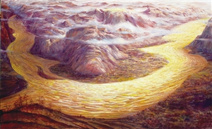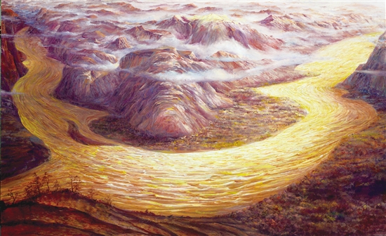 他画笔下的高原充满阳光和质感,初春的油菜花海,黎明的农舍炊烟,秋天的金色果园;艳阳下,红土上,在粗犷的各种对比之下形成和谐;从幼时出生的老宅,童年嬉戏的小巷,明亮朴素的小院,到文昌宫前的那棵老桂花树……画面已然凝聚成浓厚的儿时记忆和怀乡色彩,让人透过真实的物象隐约看到艺术家真实的自我。
