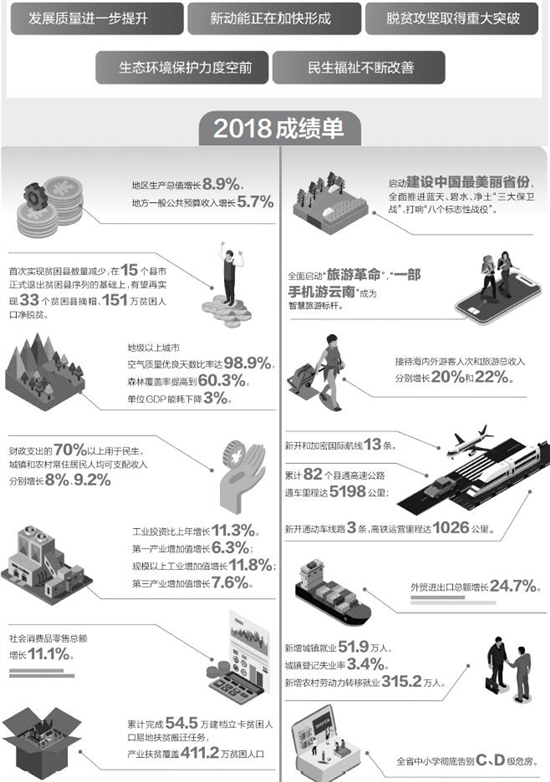 昨日上午,云南省第十三届人民代表大会第二次会议在云南海埂会堂隆重开幕。省长阮成发代表省人民政府向大会报告工作,全面回顾总结了2018年的主要工作和取得的成绩。 《政府工作报告》指出,2018年云南发展质量进一步提升。在固定资产投资增长11.6%、低于预期目标的情况下,实现地区生产总值增长8.9%,地方一般公共预算收入增长5.7%,经济转型升级初见成效。可以说,2018年云南交出了一份漂亮的答卷。 发布会 昨日,2019年云南省两会系列新闻发布会·经济社会发展主题新闻发布会在海埂会堂举行。过去一年,我省经济社会发展取得了哪些瞩目成绩?发布会上,省发展改革委、省财政厅、省统计局相关负责人进行了介绍。 经济社会发展 GDP增速排全国第三 云南省发展和改革委员会副主任、云南省统计局局长李灿和介绍,2018年,全省“稳”的基础进一步夯实,“进”的势头进一步增强,经济运行稳中向好,经济社会发展特点突出、亮点纷呈。 房地产投资同比增长16.5% 经国家统计局审核反馈,2018年,云南完成地区生产总值17881.12亿元,同比增长8.9%,增速比全国(6.6%)高2.3个百分点,排全国第3位。 全省固定资产投资(不含农户)同比增长11.6%,增速高于全国(5.9%)5.7个百分点,排全国第3位。 分产业看,第二产业在连续两年负增长的情况下扭负为正,同比增长11.3%;从房地产市场看,全省房地产投资同比增长16.5%。 万元GDP能耗下降3% 2018年,云南启动建设中国最美丽省份,全面推进蓝天、碧水、净土“三大保卫战”,打响九大高原湖泊保护治理等“8个标志性战役”,生态环境质量不断改善。万元GDP能耗下降3%。 15个县市正式退出贫困县序列 脱贫攻坚取得重要进展。新增34.5万人易地扶贫搬迁任务指标落地、政策落实,十大攻坚战有力推进,15个县市正式退出贫困县序列,有望实现33个贫困县摘帽、2298个贫困村出列、151万贫困人口净脱贫,2018年我省取得了历史上最好脱贫成绩。 财政收入 财政收入质量实现新提升 经济迈上高质量发展轨道 2018年全省财政预算执行情况如何?省财政厅副厅长杨昆介绍,2018年,全省地方一般公共预算收入完成1994.3亿元,增长5.7%。全省地方一般公共预算支出完成6074.9亿元,同比增支362亿元,增长6.3%。 税收收入占地方一般公共预算收入比重上升为71.4%,比上年提高6个百分点,129个县(市、区)非税收入占比全部下降到50%以下。财政收入质量实现新提升,从另一个方面也反映云南经济迈上了高质量发展轨道。 财政节能环保支出186.7亿元 2018年,全省各项重点支出得到有效保障。其中,全省财政节能环保支出186.7亿元,支持九大高原湖泊保护治理和六大水系水质保护,支持“蓝天、碧水、净土”行动和八大污染防治标志性战役等。 降低企业成本952.3亿元 为促进经济平稳健康较快发展,我省加大支持基础设施、教育、医疗卫生、文化等领域补短板力度、全面落实减税降费政策,全年降低企业成本952.3亿元。 466亿元助力县域高速“能通全通” 筹措资金466亿元,助力全省县域高速公路“能通全通”工程。 本报记者 宋金艳 张勇 孙琴霞 饶达诚 王云
