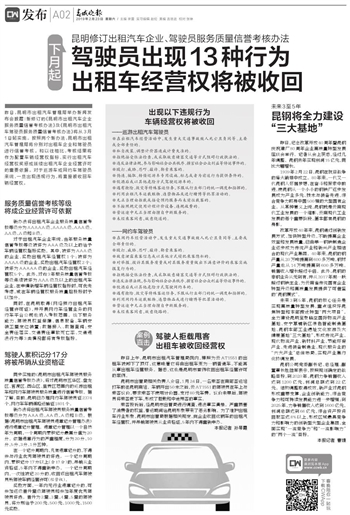 昨日,昆明市出租汽车管理局举办新闻发布会披露:新修订的《昆明市出租汽车企业服务质量信誉考核办法》及《昆明市出租汽车驾驶员服务质量信誉考核办法》将从3月1日起实施。按照两个新办法,昆明市出租汽车管理局将分别对出租车企业和驾驶员进行信誉考核。和以往相比,考核结果将作为配置车辆经营权指标、实行出租汽车经营权奖惩或延续出租汽车企业经营许可的重要依据。对于巡游车或网约车驾驶员来说,一旦出现违规行为,将直接被收回车辆经营权。 服务质量信誉考核等级 将成企业经营许可依据 新办法将出租汽车企业服务质量信誉考核等级分为AAAAA级、AAAA级、AAA级、AA级、A级和B级。 对于出租汽车企业来说,当年服务质量信誉考核等级被评为AAA级及以上的给予车辆经营权指标奖励。其中,被评为AAA级的企业,奖励出租汽车经营权1个;被评为AAAA级的企业,奖励出租汽车经营权2个;被评为AAAAA级的企业,奖励出租汽车经营权5个。此外,对近3年服务质量信誉考核等级连续被评为AAA级及以上的出租汽车企业,在申请新增车辆经营权指标时,可优先考虑,或在车辆经营权服务质量招投标时予以加分。 同时,在昆明取得《网络预约出租汽车经营许可证》,并开展网约车经营业务的网约车平台公司也纳入考核范围。线下服务能力、驾驶员权益保障、信息报备、车辆安装卫星定位装置;数据接入、数据查阅;安全责任落实、交通责任事故死亡率、交通违法行为等3类情况都将有考核指标。 驾驶人累积记分17分 将被吊销从业资格证 同步实施的《昆明市出租汽车驾驶员服务质量信誉考核办法》,将对昆明市五华区、盘龙区、官渡区、西山区、呈贡区范围内的巡游出租车和网约车驾驶员服务质量进行信誉考核。据了解,目前,昆明已办理网约车驾驶员证2374个,网约车车辆道路运输证1801个。 新办法将出租汽车驾驶员服务质量信誉考核等级分为AAA级、AA级、A级和B级。根据《昆明市出租汽车驾驶员违章记分管理办法》进行违章记分管理。违章记分管理以一个自然年为周期,一个周期内累积记分最高分值为20分。依据违章行为的严重程度,分为20分、10分、5分、3分、1分五种。 在一个记分周期内,凡有违章记分的,不得参与行业优秀驾驶员的评选。一个记分周期内,累积记分17分以上(含17分)的,吊销从业资格证,5年内不得重新申办。一个记分周期内,一次性被记20分的,收回该出租汽车驾驶员所驾驶车辆经营许可(经营权)。 奖励方面,一年内无行业违章记分的,可参加逐级晋升星级驾驶员和参加年度优秀驾驶员评选。晋升为2星、3星、4星、5星的驾驶员,将分别给予200元、500元、1000元、1500元奖励。 出现以下违规行为 车辆经营权将被收回 ——巡游出租汽车驾驶员 ●在出租汽车经营活动中,发生重大交通事故致人死亡且负同等、主要或全部责任的。 ●私自改装、调整计价器造成计费失准的。 ●拒绝接受依法检查,或采取故意堵塞交通等方式阻碍行政执法的。 ●违反法律法规,参与影响社会公共秩序、损害社会公众利益等停运事件的。 ●殴打、威胁、恐吓、敲诈、勒索乘客的。 ●伪造、骗取、转借巡游车专用设施、标志或者为前述行为提供条件的。 ●饮酒后或以其他危险方式驾驶巡游车的。 ●遇有抢险、救灾等特殊客运任务,不服从行业部门的统一调度和指挥的。 ●利用出租汽车运载赃物、违禁物品或进行赌博等犯罪活动的。 ●无正当理由拒载或接受预约服务而未前往载客的。 ●不按照规定使用计程计价设备、违规收费的。 ●营运途中无正当理由擅自中断服务的。 ●未经乘客同意,故意绕道的。 ——网约车驾驶员 ●在网约车经营活动中,发生重大交通事故致人死亡且负同等、主要或全部责任的。 ●殴打、威胁、恐吓、敲诈、勒索乘客的。 ●故意泄露乘客信息或以其他方式侵犯乘客隐私的。 ●对举报、投诉其服务质量或对其服务质量做出不满意评价的乘客实施报复行为的。 ●拒绝接受依法检查,或采取故意堵塞交通等方式阻碍行政执法的。 ●违反法律法规,参与影响社会公共秩序、损害社会公众利益等停运事件的。 ●饮酒后或以其他危险方式驾驶网约车的。 ●遇有抢险、救灾等特殊客运任务,不服从行业部门的统一调度和指挥的。 ●利用网约车运载赃物、违禁物品或进行赌博等犯罪活动的。 ●营运途中无正当理由擅自中断服务的。 ●未经乘客同意,故意绕路的。 案例直击 驾驶人拒载甩客 出租车被收回经营权 昨日上午,昆明市出租汽车管理局院内,牌照为云AT1551的出租车被卸下了顶灯,这意味着它将由出租车变为一辆普通车,不能再从事出租车经营服务。据悉,这也是昆明市首例收回出租车经营许可的案例。 昆明市出管局相关负责人介绍,1月24日,一名乘客在南部客运站打车前往昆明南站。车辆开出50米之后,云AT1551的驾驶员在车上与乘客议价,要求乘客不使用计价器,支付80元车费。议价未果后,驾驶员将乘客赶下车,形成了拒载和中途甩客的事实。 乘客投诉后,经昆明市出管局进行调查,违法事实清楚。严重损害了消费者的权益,春运期间给昆明形象带来了恶劣影响。为了维护出租车行业形象,昆明市出管局根据相关规定,向企业收回这辆车的出租汽车经营权,并吊销驾驶员从业资格证,5年内不得重新申办。 本报记者 孙琴霞