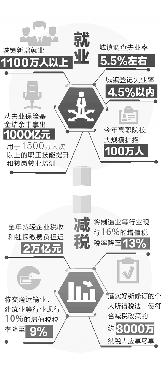 政府工作报告提出,多管齐下稳定和扩大就业。扎实做好高校毕业生、退役军人、农民工等重点群体就业工作,加强对城镇各类就业困难人员的就业帮扶。对招用农村贫困人口、城镇登记失业半年以上人员的各类企业,3年内给予定额税费减免。加强对灵活就业、新就业形态的支持。坚决防止和纠正就业中的性别和身份歧视。实施职业技能提升行动,从失业保险基金结余中拿出1000亿元,用于1500万人次以上的职工技能提升和转岗转业培训。 教育 高职院校今年扩招100万人 政府工作报告提出:改革完善高职院校考试招生办法,鼓励更多应届高中毕业生和退役军人、下岗职工、农民工等报考,今年大规模扩招100万人。 扩大高职院校奖助学金覆盖面、提高补助标准,加快学历证书和职业技能等级证书互通衔接。改革高职院校办学体制,提高办学质量。中央财政大幅增加对高职院校的投入,地方财政也要加强支持。设立中等职业教育国家奖学金。支持企业和社会力量兴办职业教育。 解读:“中国制造需要中国技工。”来自哈尔滨九洲电气股份有限公司的全国人大代表李寅介绍,随着新能源技术的发展,公司将新招聘大批职业技术工人,“大力发展职业教育,为社会和企业培养高素质技术技能型人才,是传统制造业转型发展、企业实现智能制造的有力保障。” 据统计,2018年,全国有职业院校1.17万所,年招生928.24万人,在校生2685.54万人。在现代制造业、新兴产业中,新增从业人员70%以上来自职业院校。职业教育已经具备了大规模培养技术技能人才的能力,为国家经济社会发展提供了不可或缺的人力资源支撑。 医卫 高血压等门诊用药纳入医保报销 政府工作报告提出:要实施癌症防治行动,推进预防筛查、早诊早治和科研攻关,着力缓解民生的痛点。做好常见慢性病防治,把高血压、糖尿病等门诊用药纳入医保报销。 解读:记者从国家卫生健康委员会了解到,我国癌症诊疗体系正在逐步建立健全。国家卫健委副主任李斌介绍说,我国已开展国家癌症中心、区域癌症诊疗中心和肿瘤临床重点专科建设,以肿瘤医院、综合医院肿瘤科、基层医疗卫生机构、康复医院、安宁疗护中心为主体的癌症诊疗和康复体系初步形成。 李斌说,我国已建立肿瘤登记年报制度,目前全国建有肿瘤登记处574个,覆盖4.38亿人口,较为全面地掌握了我国癌症发病、死亡、生存状况及发展趋势。下一步,国家卫健委将采取综合措施持续加强癌症防治工作,切实降低癌症死亡率,更好满足百姓健康需求。 国家心血管病中心预防医学处副处长李静说,根据国家心血管病中心的数据,我国心血管病患者中绝大部分是高血压患者。医学研究认为,控制好高血压能大幅降低心血管疾病发生率。国家卫健委委托我们成立基层高血压管理办公室,目前已经培训了一百多万名基层医务人员,让更多患者不出社区就能把疾病管理好。 就业 城镇新增就业1100万人以上 政府工作报告提出:就业优先政策要全面发力。今年城镇新增就业1100万人以上,城镇调查失业率5.5%左右,城镇登记失业率4.5%以内。 就业是民生之本、财富之源。今年首次将就业优先政策置于宏观政策层面,旨在强化各方面重视就业、支持就业的导向。 解读:全国人大代表、湖南省株洲市市长阳卫国说:“实现更高质量和更充分就业,是经济迈向高质量发展的重要体现,也是民生的基础保障。”他表示,在推进产业结构转型升级的过程中,更需要用新的产业空间支撑广泛的就业机会,以实现就业形势稳中向好。 “在经济增速放缓、经济结构加快调整的关键时期,就业的稳定器作用尤为重要。”全国人大代表、西部矿业集团有限公司董事长张永利认为,稳就业首先要稳企业。“支持中小企业发展就是稳就业的具体举措,要解决中小企业融资难融资贵问题,只要搞活企业,就业就稳住了。” 人力资源社会保障部有关负责人表示,要进一步扎实做好高校毕业生、退役军人、农民工等重点群体就业工作,加强对城镇各类就业困难人员的就业帮扶。 脱贫攻坚 农村贫困人口减少1000万以上 政府工作报告提出:2019年农村贫困人口减少1000万以上。打好精准脱贫攻坚战。重点解决实现“两不愁三保障”面临的突出问题,加大“三区三州”等深度贫困地区脱贫攻坚力度,落实对特殊贫困人口的保障措施。 解读:全国人大代表、苏宁控股集团董事长张近东说,政府工作报告中对于减贫1000万以上这一目标的设定体现了党和国家对于打赢脱贫攻坚战的决心与信心。 当前我国脱贫攻坚战取得了决定性进展。2018年,全国有1386万农村贫困人口摆脱贫困,预计有280个左右贫困县摘帽。2018年末,全国农村贫困人口从2012年末的9899万人减少至1660万人,累计减少8239万人;贫困发生率从2012年的10.2%下降至1.7%,累计下降8.5个百分点。 “集中我们的政治优势和已经取得的实践经验,按照现行标准减贫1000万以上的目标是完全可以实现的。”全国人大代表、安徽省农业科学院副院长赵皖平说,脱贫攻坚要激发贫困户内生动力,不仅要“富口袋”还要“富脑袋”。 国务院扶贫开发领导小组办公室新闻发言人苏国霞说:“今年我们的工作将重点关注两个方面:一是攻坚克难,聚焦深度贫困地区、特困人口和影响‘两不愁三保障’的突出问题;二是巩固成果,稳定脱贫,持续发展。”据新华社