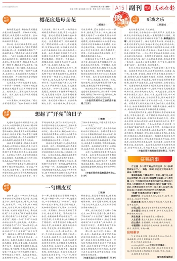 □杨德云 每年樱花盛开,都会把昆明圆通山装点成花的世界。不知从何时起,樱花开,就是昆明人的赏花节。在如潮的游人中,我特别羡慕那些扶老携幼的举家赏花者。 很小时,也随父母来看樱花,我是长子,自然爱高谈阔论:“那边有樱花搭的路,风一吹,花瓣落得地都红了。”妈妈笑着说:“那是海棠,这些才是樱花呢……”我仔细比较,还是没弄清樱花和海棠的区别。妈妈解释道:“海棠是灌木,有很多树干,樱花是乔木,只有一根树干,樱花是好几朵挤在一起开,看起来是一团一团的,花落后也是几朵连在一起不分的。”妈妈叫王建忠,是徐州人,是跟着爸爸到昆明后才结婚定居的。所以时不时就会讲起徐州老家笑傲春雪的樱花。 父亲在我十岁时就离开了我们。一个弟弟一个妹妹,一家四口的生活重担全压到没有正式工作的母亲身上。就凭做零工,居然没让我们兄妹失学。当然,我们也很多年没到圆通山看樱花了。 一个星期六,妈妈突然说:“明天全家看樱花去!”我和弟妹们兴奋得几乎失眠。第二天一早,一向节俭的妈妈竟然带我们上馆,买了一大盘炒饵 。整天吃惯青菜杂粮的我和弟妹 们在大吃将尽时才发现妈妈一点没吃。坐在樱花树下,听妈妈称赞道:“樱花树同根一条心,开时抱成团,仰望灿如红霞,纵然被大风吹落也是几朵相连永不分,拾起来仍是一束花。我们在遇到困难时为什么不能团结不分离呢?”妈妈要我们以后事业像樱花一样辉煌。于是就以一棵樱花自比,妈妈当然是树干,我是其中一枝,弟妹们也各选一枝。 终于我们兄妹都学成工作了,那年是我们请妈妈赏樱花。全家在樱花树下唱了很多歌后妈妈说,爸爸去世时曾有一邻居女人指着后背说:“哭什么,过几天再找个男人照样过好日子。”从此妈妈就下决心,几十年来,从不单独和男人来往,立志抚养我们成才。如今心愿实现了。说起爱樱花,妈妈说日本投降那年刚到昆明,也是圆通山花开,忽然看到唱着抗日歌曲南下的同学潘琰在花枝下读书。潘琰是徐州铜山人,正在西南联大上学。他乡遇故知,其乐无比。可就在那年,震惊全国的一二·一事件中,潘琰成了烈士。从此,殷红的樱花又增添了一份对故交烈士的怀念。我们和妈妈约定,每年都陪妈妈看樱花,还要陪妈妈到从来没有回去过的徐州老家和铜山去看樱花,就此怀念潘琰阿姨。但谁知道,这么容易的心愿竟不能实现,第二年樱花开,劳苦一生的妈妈正患癌症住院,并于樱花凋落时谢世而去。 转眼又过了二十多年,我已是年过半百,每当站到盛开的樱花树下,总会涌起太多的感叹。仰望樱花,我仿佛看到了天堂的色彩,想起了妈妈,想起了潘琰阿姨。傲然繁茂的樱花,多像历经国难家贫而为子女无私奉献的万千妈妈。我们会永记樱花的品格——一条心,抱成团,永不分。妈妈,您知道吗,我们兄妹都取得了骄人的成绩,这都是您多年辛劳开的花。 世上何止万千正在辛劳的妈妈。正受慈母深恩的孩子们,我们都有一个好妈妈,请帮我了却一个心愿,每年春天,都陪妈妈看樱花吧,樱花应是母亲花。 (作者系昆明市化工技校退休教师,72岁)
