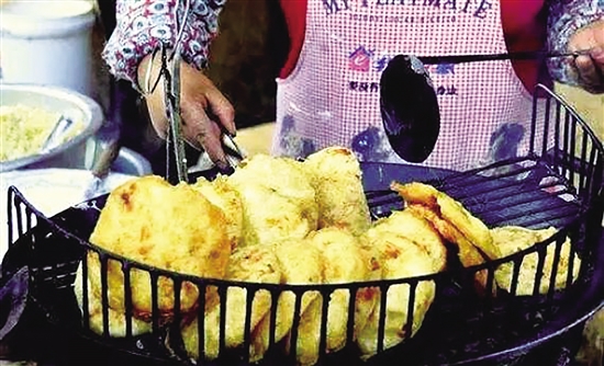 把烤好的饵公式,抹上香香的花生酱、甜酱及拌好佐料的辣椒酱,放入油糕包起来,咬一口,油糕的酥脆,饵公式的糯软,辣椒酱的香辣瞬间充盈你的味觉世界。