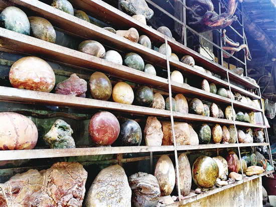 一块乌木生成的“宣威火腿”,难辨真假的“腊肉”奇石,逼真形象的嫦娥奔月、大鹏展翅……对于自己上百件根雕、奇石宝贝,今年74岁的宣威老人杨廷荣如数家珍,娓娓道来。 爱上根雕奇石娱晚年 青山绿水,日暖风和。人杰地灵的宣威西泽乡大龙潭村,有一个特别的小院,这里住着一对恩爱幸福的老人。 走进风景旖旎的大龙潭,意外发现了“老杨艺术园”。老远就看到门口摆满了各种奇石根艺,院门口悬挂着一只羊头。“挂上真羊头,寓意老杨家。目的就是让人记住这里,这里有我喜欢的乡村田园生活……”,主人杨廷荣老人快乐地说。 杨廷荣老人今年74岁,身体硬朗,善于言谈。见到记者一行,老人家热情地招呼着,邀请到家里做客。择一方小院,与爱的人,风雨前行,一起看日出日落,相伴一生。“老杨艺术园”就是这样一方院落,简单温暖。门口种满了各种水果,橘子挂满树头,火红的柿子摇曳枝头,还有两只名叫“欢欢”“喜喜”叽叽喳喳欢腾不已的小鸟,透过斑驳陆离的青瓦,远山含黛,薄雾缭绕,鸟鸣山涧,甚是惬意。 杨廷荣,一位半道迷上树根雕琢的农村老人,硬是靠自学揣摩,把不起眼的朽木疙瘩雕琢成栩栩如生的艺术作品,诠释了“朽木可雕”。 踩着木板楼梯,来到二楼,眼前堆满了老杨的各种杰作。 老杨说,他就是一个地地道道的农民,没什么文化。一直就和老伴靠种地做点米皮等养家糊口。50多岁时,他突然生了重病。在宣威城区医院看病期间,他的儿子带着他到花鸟市场闲逛。“看到那些根雕、石头等玩意儿,我顿时眼前一亮,这些东西么在老家多得很嘛。”一次闲逛,让老人与根雕奇石等结缘,从此迷上后就难以释手。不为钱财,只为知己……以雕琢朽木、把玩奇石来丰富晚年生活,闲情逸致,延年益寿。 一块腊肉石要卖100万 “这块腊肉石,别人已给到30万元,我不卖!我要卖100万!要是国家来收藏,我愿意分文不取捐献出来。”指着一块石头,老杨如此激动地说。只见一块石头状的“腊肉”,老人起名叫“改革之花”,从骨肉的切面再到骨油的光泽、渗出的纹路,五花肉感简直逼真至极,肉眼观看几乎以假乱真。老杨自豪地说,眼前的这块石头简直就是一块腊肉的翻版,大自然的鬼斧神工,竟然能把它的每个构造与颜色都生得近乎完美。 多年前,老杨去山林寻找木桩。在离家不远一个叫半坡的地方,一段水沟中意外发现石头。当时石头露出浅浅的一截,完全看不出“腊肉”的本色,但就是有眼缘,觉得肯定是个“宝贝”。老杨惊喜万分,赶紧拨弄水草,把石头拉出水面。“哇!用水洗过以后,简直就跟一吊真的挂肉一样!”老杨如获至宝,多年来小心珍藏。 让老杨最得意的还有一块“大火腿”,一块乌木生成的最上乘“宣威火腿”,起名叫“驰名中外”,因宣威火腿飘香美名扬。曾经有人给他8000元想要买下乌木“火腿”,老杨硬是没舍得卖,他觉得应该给到有缘人的手中,至于钱多钱少都无所谓,重要的是发挥它的艺术价值,宣传宣威火腿。 20多年来,老杨自迷上木雕之后,经常徒步上山,穿梭在山林之间,寻找可塑性的树根,把一个个树桩背回家,最终又在脑子里构思,揣摩着木雕作品、寓意;他也曾跑到家门前流淌而过的小江里捡石头,收集各种别有韵味的奇石,晚年生活多姿多彩。“我不拜师不收徒,完全靠自学感悟,作品不精,但都是一点一滴打磨出来的!”老杨毫不避讳地说。老人家对自己的每一件作品都能说得头头是道,还赋予了鲜活的生命力。 雕琢树根只为老来乐 谈及自己的晚年生活,老杨特别满足地说,木雕奇石之类的爱好,其实就是自己大病痊愈后找寻到的乐趣,丰富了晚年生活,有个精神寄托。老人说,每次静下心来雕刻时,都感觉是一种享受。通过去皮清洗、脱水干燥、定型、精加工等步骤,创作出一个作品,人就觉得神清气爽,心情愉悦,身心得到了磨练。 “我年纪也大了,不愁吃也不愁穿,儿女都各忙各的事业。闲暇之余,和老伴种种花,弄点米皮在家门口卖点钱,捯饬下我这些木疙瘩、石头疙瘩,也算是一种艺术追求。艺术是有生命的,可能我的作品在别人眼里不算什么,在我眼里却是无价的。静下心来摆弄这些东西,真的可淡泊名利,延年益寿!”老杨开心地说。 老杨还特别表示,木雕的最高境界就是遵从大自然,对根雕因材施教,不能大修大改,追求天人合一。据他介绍,20多年来他一共收集了几百件大小不一的木雕作品,有的拱手送给了有缘人,还一次性卖过108件给木雕老板,获得6万元左右的辛苦费。现在,老人的阁楼上还有不足百件的作品,各地到西泽大龙潭游玩的人,感兴趣都会到“老杨艺术园”逛一逛,观赏把玩下老人的艺术之作。每当有游客来,老杨都会乐呵呵地接待,讲解诠释每一个作品。老人晚年矍铄的精神状态,以及闲云野鹤般的心境,感染了很多人,叫人好生羡慕。 本报记者 蒋琼波 摄影报道