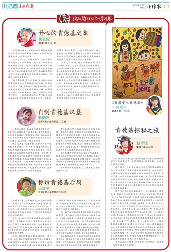 说到肯德基,大家都熟悉,一个知名快餐店。我曾品尝过里面美味的汉堡包、薯条、冰淇淋等等,每次想到这都会忍不住流口水,可今天不一样,我带着好奇心,以春晚小记者的身份来到肯德基的后厨,了解肯德基后厨与汉堡制作的奥秘。 下午2点,我们小记者怀着激动的心情进入餐厅,肯德基的工作人员果果姐姐先是让我们了解了食物宝塔小百科,一位身着白长衫的“科学家”叔叔现场检测果蔬农残的指标,有了他们对食品安全的把关,让我们的生活健康有了保障。 现在,到肯德基的后厨探秘环节。进入之前,我们都被严格要求穿戴了帽子和围裙,并按照规定消毒洗手,确保安全卫生。我们进入到肯德基的冷冻库,这里的温度在零下27摄氏度,每一袋食品都被贴上了七彩时间条,七种颜色分别代表一周中的7天,每一天的时间条上都写着“开始使用时间”和“废弃时间”,确保食材的安全。 终于到了我们最盼望最喜欢的制作汉堡包的环节。肯德基的工作人员给我们端来了面包、炸鸡块、番茄酱、生菜等等一大堆的食材,我们小记者个个垂涎欲滴。在果果姐姐的指导下,我自己动手把面包分成两半,依次放入鸡块、生菜,最后再挤上美味的番茄酱,合上面包,大功告成了。虽然过程简短,但是妙趣横生。当我吃到自己做的汉堡时,觉得味道棒极了。 在这探秘之旅中,我知道了为什么汉堡包里要放生菜,因为这样才能让食材搭配均衡,营养健康。对于我们来说,合理饮食可以让我们用强健的体魄去塑造自己的未来,拥抱美好的明天。