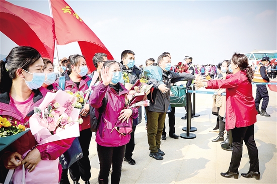 隔空拥抱,欢迎英雄回家。本报记者 龙宇丹 摄