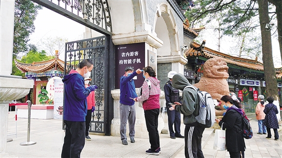 昨日,昆明市大观公园、金殿风景名胜区面向社会有序恢复开放,记者当天对两大公园进行走访,发现公园开放后,许多游客入园踏青赏景,十分有序。 上午9时,金殿名胜区恢复开放,部分游客早早来到景区门口等待开园,开园后通过扫描“云南抗疫情”、测量体温并购票入园,现场秩序良好。 目前,部分山茶花晚花品种仍在开放。而在杜鹃园片区,映山红、马缨花等正是盛花期,引来众多游客观赏;此外温室片区的垂丝海棠和虞美人、水景园片区的碧桃也正是观赏的最佳时期,喜欢花的市民可做好防护前往观赏。 10时30分许,记者来到昆明市大观公园,在公园门口,游客们均戴着口罩,主动配合工作人员做体温检测等工作。进入公园,游路两侧的郁金香虽已进入花期尾声,仍吸引众多游客驻足拍照。在近华浦,还有许多各色郁金香在盛开,这里赏花的游客更多,但都主动避开,分散观赏。除了郁金香外,还有许多刚开的垂丝海棠,形成了一片海棠大道,春意盎然;而大观公园随处可见的碧绿色垂柳也成一景;公园内的玛格丽特也争相开放,成片的花海正是盛花期;在这里踏青赏花,无疑是最佳的去处。 公园管理员介绍,该园从9时开园至10时许,入园的游客有531人;至17时,全天入园人数为3109人次,还未达到瞬时最大承载量1万人的限流标准。 本报记者 左学佳 摄影报道