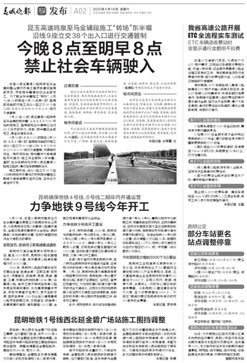 因地铁1号线西北延金碧广场站施工需要,经交管部门批准,将于2020年4月18日晚对金碧路站进行围挡调整,沿河路至东寺街口路段的施工围挡由临近昆华医院一侧整体调整至金碧路路中,围挡长约260米、宽约21米。 围挡调整后,金碧路主干道将调整为双向5条机动车道和2条人非混行道,其中围挡北侧自东向西方向为2条3.5米宽机动车道和1条5米宽人非混行道,自西向东方向为1条3.5米宽机动车道;围挡南侧自西向东方向设2条3.25米宽机动车道和一条5米宽人非混行道。 由于该路段车流量较大,为保证东寺街、金碧路进入昆华医院的车辆通行顺畅,经交管部门批准,在东寺街与金碧路交叉口处设置由南往北方向调头点,金碧路南侧紧邻昆华医院的1条机动车道为进入医院的专用通道,另一条机动车道的车辆不能并入专用通道,须直行后右转至东寺街进入昆华医院地下停车场。为避免该路段违法并道行为发生,此处已增设违法并道抓拍探头。 本报记者 张勇