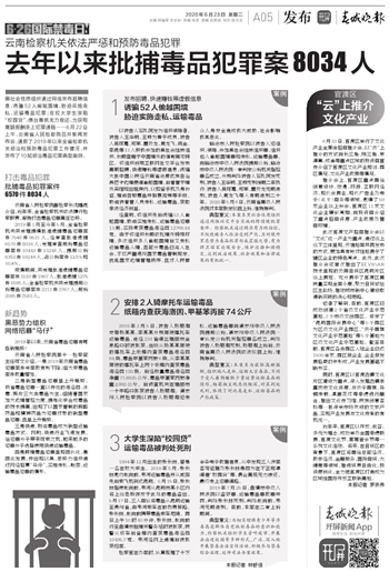 黑社会性质组织通过网络发布招聘信息,诱骗52人偷越国境,胁迫实施走私、运输毒品犯罪;在校大学生深陷“校园贷”,债台高筑无力偿还,为获取高额报酬走上犯罪道路……6月22日上午,云南省人民检察院召开新闻发布会,通报了2019年以来全省检察机关惩治和预防毒品犯罪工作情况,并发布了10起惩治毒品犯罪典型案例。 打击毒品犯罪 批捕毒品犯罪案件 6570件8034人 云南省人民检察院副检察长沈曙昆介绍,近年来,全省检察机关依法履行检察职责,保持打击毒品犯罪高压态势。 2019年1月至今年5月,全省检察机关共受理提请批准逮捕毒品犯罪案件7548件9531人,经审查批准逮捕6570件8034人;受理审查起诉毒品犯罪案件10443件13248人,提起公诉8353件10244人,占公诉案件12.5%和10.4%。 疫情期间,共受理批准逮捕毒品犯罪案件1510件1967人;批准逮捕1275件1595人;全省检察机关共受理提起公诉毒品犯罪案件2212件2767人;起诉2085件2583人。 新趋势 黑恶势力组织 网络招募“马仔” 2019年以来,云南省毒品犯罪有哪些新趋势? 云南省人民检察院第十一检察部主任可文介绍,一是2019年云南省毒品犯罪案件受案数有所下降,但大宗毒品案件数量增加。 二是新型毒品犯罪呈上升趋势。我省毒品犯罪一直以传统的海洛因、冰毒、鸦片三大类毒品为主,但随着国家加大边境管控力度,提炼化学合成毒品的技术提高,出现了以国家管制的麻醉药品和精神药品为犯罪对象的新型毒品犯罪,且呈上升趋势。 三是快递、物流毒品成为新型运输毒品方式。网购、快递行业飞速发展,给犯罪分子带来可乘之机,越来越多的犯罪分子选择使用快递运输毒品。 四是跨境毒品犯罪呈现团伙化、集团化发展,并出现以黑、恶势力组织通过网络招募“马仔”,实施走私、贩卖、运输毒品犯罪的情形。 案例1 发布招聘、快速赚钱等虚假信息 诱骗52人偷越国境 胁迫实施走私、运输毒品 以被告人石扎阿发为组织领导者,被告人王华明、王帅为骨干成员,被告人吴可嘉、郑军、雷云龙、周龙飞、闫金、李昆等13人积极参加的黑社会性质组织,长期盘踞于中国境外的缅甸南邓特区。该组织利用互联网社交平台发布高薪招聘、快速赚钱等虚假信息,诱骗大批中国公民经云南省沧源佤族自治县芒卡边境便道偷越国境,后看管于境外宾馆和出租房内,以扣留手机及身份证、强迫吞服毒品并拍摄视频等手段,胁迫被看管人员走私、运输毒品,获取非法经济利益。 经查明,该组织先后诱骗52人偷越国境,胁迫实施走私、运输毒品犯罪13起,实际缴获毒品海洛因12768.44克。由于该组织长期依托境外特殊环境,多次组织多人偷越国境后又走私运输毒品入境,且部分毒品已流入社会,不仅严重违反国家毒品管制规定、扰乱国家边境管理秩序,且对人民群众人身安全造成极大威胁,社会影响极其恶劣。 临沧市人民检察院以被告人犯组织、领导、参加黑社会性质组织罪、组织他人偷越国境罪和走私、运输毒品罪,向临沧市中级人民法院提起公诉,临沧市中级人民法院一审判定公诉机关指控罪名成立,分别判处被告人石扎阿发死刑,被告人王华明、王帅死刑缓期二年执行;被告人吴可嘉、郑军、雷云龙无期徒刑,被告人周龙飞等人有期徒刑二十年。2020年5月6日,云南省高级人民法院对本案裁定驳回上诉,维持原判。 典型意义:本案系黑社会性质组织通过网络社交平台实施的跨国境犯罪案件。检察机关通过精准有力的指控,不仅使被告人依法受到严惩,且对境外黑恶势力毒品犯罪形成震慑之势,有力捍卫国家边境安全,维护边疆和谐稳定,达到政治效果、社会效果和法律效果的有机统一。 案例2 安排2人骑摩托车运输毒品 纸箱内查获海洛因、甲基苯丙胺74公斤 2018年2月5日,被告人杨菊湘安排杨某某、李某某分别驾驶摩托车运输毒品,途经234省道岔瑞丽市金泉路口时被抓获,当场从杨某某驾驶的摩托车上纸箱内查获毒品海洛因84块,毒品甲基苯丙胺6块,从李某某驾驶的摩托车上两个纸箱内查获毒品海洛因120块。后经称量毒品海洛因净重71.8825公斤,毒品甲基苯丙胺净重2.992公斤。后侦查机关在瑞丽市一十字路口抓获被告人杨菊湘。德宏州人民检察院以被告人杨菊湘犯走私、运输毒品罪向德宏州中级人民法院提起公诉,德宏州中级人民法院一审认定公诉机关指控罪名成立,判处被告人杨菊湘死刑,杨菊湘上诉后,云南省高级人民法院依法驳回上诉,维持原判。 典型意义:本案系为获取高额报酬,组织他人走私、运输大宗毒品,不同于受人雇佣赚取少量运费运输毒品的情形,杨菊湘主观恶性极深,对其判处死刑,体现了对此类走私、运输毒品的严惩政策。 案例3 大学生深陷“校园贷” 运输毒品被判处死刑 1994年12月出生的张长林,曾是一名在校大学生。2018年5月,张长林邀约赵向前、韦河运输毒品并从咸阳先后乘飞机到达昆明。5月15日,张长林指使赵向前、韦河从昆明市某小区内将上线老板存放于此处的毒品盗出。5月17日,三人商议将毒品从昆明运输至贵州省,由韦河乘车在前负责探路,张长林、赵向前携带毒品乘车尾随。同日上午10时40分许,张长林、赵向前行至曲靖市胜境关警务站时被抓获,民警从该车后备箱内查获毒品海洛因10495.7克。韦河经网上通缉后被抓获归案。 检察官在办案时,认真梳理了十万余条电子数据信息,从中发现三人涉案客观证据及张长林是因为在不正规渠道