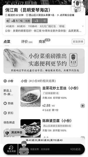 日前,昆明市文明办发出“2020昆明市制止餐饮浪费培养节约习惯倡议书”,号召全市各级各部门、各餐饮企业、广大市民朋友做光盘行动的参与者、珍惜粮食的推动者,让餐饮节约美德蔚然成风。那么,昆明的餐饮企业是如何做的呢?8月17日,晚报记者走访了昆明市区内的部分餐饮店和外卖平台,发现餐饮企业都在通过点菜时提醒适量、鼓励打包、推出半份菜和半份饭等举措,引导消费者一起来实行“光盘行动”,制止餐饮浪费行为。 堂食 餐厅打包盒免费 80%客人选择打包 “每天到我们店吃饭的客人大概有500-800人,每天的剩菜剩饭在50-100公斤左右。店内的浪费情况不算太严重,店里免费帮客人打包,不收取餐盒费,80%的客人在有剩菜的情况下会选择打包带走。同时,在顾客进店开始点餐时店员也会根据人数提醒顾客适量点餐,不够再加,或根据顾客人数推荐相应数量的菜品。此外,店内也通过张贴提示牌、宣传画等方式,让顾客养成勤俭节约的良好习惯。”茄子恰恰正义坊店店长丁先生告诉记者,他们店一直以来都是2-4人小桌,浪费情况较少,大桌的浪费情况较大。造成顾客浪费粮食的主要原因有两个,首先是一些顾客刚进来时很饿,容易多点菜,导致吃不完,也有部分顾客碍于面子不想打包带走。其次,有的顾客点的菜可能不合口味,最后也就成了剩菜。 丁先生表示,作为有良心的餐饮企业,必须杜绝餐桌浪费,不能只追求利益任由顾客浪费,该提醒还是要提醒,也希望所有的餐饮企业都能这样做,一起推行“光盘行动”。同时,也希望媒体能加大宣传力度,让市民们都了解“光盘行动”,并且让越来越多的人加入到“光盘行动”中来。 每浪费200克食物 收取50元罚款 台北帮厨正义坊店店员王女士告诉记者,这段时间店里每天接待的客流量大概在1000人左右,每天收拾的厨余垃圾,可以装满两只1米高的蓝色大垃圾桶。 “顾客取餐时,我们会建议顾客根据自己的食量,少拿多餐。在店内的墙壁、餐桌上也会张贴或者摆放相应的提示牌来提醒顾客。因为我们是自助餐,所以不提供打包带走服务,最后会根据顾客剩下食物的多少,来收取相应的费用以做惩罚,每浪费200克食物收取50元罚款,以此叠加。”王女士表示,推广“光盘行动”加上相应的罚款措施,使得厨余垃圾也少了,以前每天收拾的厨余垃圾大概是3-4桶,现在每天最多两桶,大约减少了1/3。 推出3元小盘菜 可以少花钱多吃菜 “店内每天接待的客流量大概在700-800人,10桌客人大概会有5桌有剩菜比较明显的现象,剩菜情况达到一半左右。每天泔水有200-300公斤,浪费情况还是比较严重的。一般来说,如果顾客是和熟悉的人一起吃饭,比如说家庭聚餐有剩菜的话,那90%的顾客都会选择打包带走;如果是和不太熟悉的人吃饭,例如公司聚餐、请客吃饭,选择打包带走的不到30%。”位于宝善街美食城3楼的外婆味道店长李先生告诉记者,造成食物浪费的原因有3个,首先是现在人们的生活水平提高了,慢慢地对食物也就不太珍惜。其次,请客吃饭时觉得菜点太少没面子,剩菜打包带走显得小家子气,就容易浪费食物。最后,现在很多年轻人吃完饭后,可能还有别的安排,拿着打包的剩菜过于麻烦,也就不愿意打包了。 李先生表示,提醒顾客不浪费已经是外婆味道员工培训的内容之一。同时,店内现在对顾客主推的都是小盘菜,减少了菜“量”,同时也降低了菜“价”。店内现在有最便宜的3元的麻婆豆腐,最贵的菜也只是69元。这样既满足顾客想少花钱多吃菜的心理,又减少了食物的浪费。开始推广“光盘行动”后,店内打包剩菜带走的顾客也越来越多,同时厨余垃圾和以前相比也减少了20%左右。相信随着大家的节约意识越来越强,浪费的情况也就越来越少。 外卖平台 主推半份餐饮 提醒顾客不要浪费 晚报记者在饿了么、美团等外卖平台搜索“半份菜”“小份菜”发现,外婆味道、日日香鹅肉饭店、冒菜火锅等都推出了半份餐食,还在平台首页上线“光盘行动”活动,主推品质小份菜,通过配送费0元起等优惠活动鼓励用户节约粮食。 “近两年来,越来越多的人在意吃得是否健康,所以除了少油少盐,对于分量的适度把握也能赢得消费者的欢心。”某川菜餐馆负责人李老板介绍,为了迎合消费者少食多样的需求,他在去年底尝试上线了小份菜活动,有多道菜品名列店内销量前五,特别是在午餐时段,基本每餐都出现小份菜的身影。“菜量少了,选择却更多,好评也明显变多了。” 8月5日至8月7日,饿了么推出“半份计划”,商家在自己的页面上架“公益半份”参与公益行为 ,以一碗米饭两元为例,消费者花1元购买“公益半份”参与公益行为,由合作企业进行捐赠,为贫困儿童送出了约3万份营养餐。 饿了么表示,今年以来已有近60万家餐厅主动推出半份菜、半份饭。同时,北京、上海、广州、昆明等多个城市的饿了么App已经上线温馨小提示,提醒用户“合理点餐,不要浪费”。 8月小份菜销量 较7月增长21% 同样,美团表示,为了更好地营造“厉行节约,反对浪费”的社会风尚,中国商业联合会、中国烹饪协会、中国饭店协会、中国连锁经营协会联合美团点评向餐饮行业发布了倡议书。 在与消费者的沟通上,倡议书倡议商户进行正面引导,避免浪费。具体包括:转变经营方式,在“光盘行动”的经验基础上推陈出新,推动健康消费;针对特定人群开发制作适应其营养需要和口味