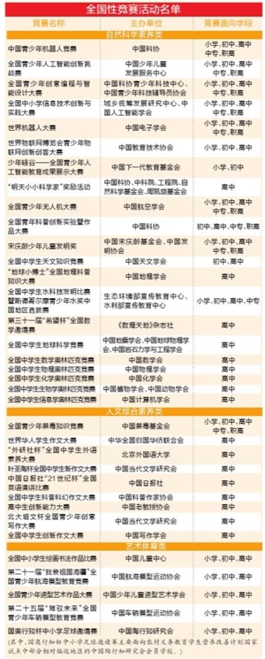 新华网北京8月20日电 日前,教育部公布了2020-2021学年面向中小学生的全国性竞赛活动名单,名单分为“自然科学素养类”“人文综合素养类”“艺术体育类”三类,共有“中国青少年机器人竞赛”等35项竞赛进入名单。