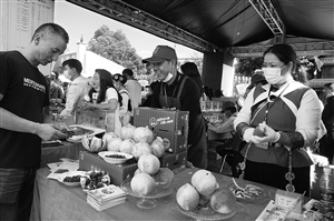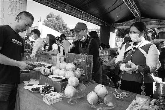 21日下午3时,以“消费扶贫庆丰收、香约丽品迎小康”为主题、为期6天的2020年丽江市农民丰收节在丽江古城玉河广场开幕。粉红桃心雪白桃肉的丽江雪桃、拦腰切开透出花朵状糖心的宁蒗2700苹果、蜜蜂单采紫云英酿出的雪蜜……一味味印上了丽江符号的特产,在秋风中香气四溢,勾起味蕾,开启了一场舌尖上的丽江之旅。据了解,丽江市2020年“中国农民丰收节”庆祝活动从9月21日开始持续到9月26日,在丽江古城玉河广场共设有玉龙县、永胜县、华坪县、宁蒗县、古城区展馆以及丽江市消费扶贫专馆等6个展区,120余种农产品。本报记者 木晓雯 摄影报道