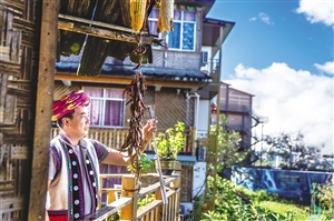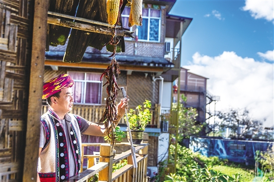在怒江州福贡县匹河怒族乡老姆登村,怒族群众郁五林在自家开的客栈直播怒江大峡谷美景。 新华社记者 胡超 摄