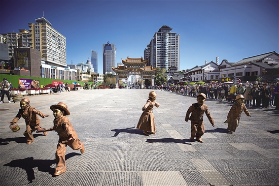 幼儿园小朋友装扮的小铜人,神秘动感民族少女舞蹈,以及宛转悠扬的小提琴独奏……19日下午3点,一场精彩歌舞快闪show在金马坊上演。 作为昆明市迎接《生物多样性公约》第十五次缔约方大会(COP15)系列宣传活动的重头戏之一。精彩的快闪show从伫立在人群中的“小铜人”开始,伴随着满是昆明记忆的老昆明童谣以及悠扬动听的小提琴声,现代时尚舞蹈演员以及柔美的花腰傣少女在神秘动感的节奏里翩翩起舞。 据悉,整场表演以快闪歌舞show的形式把本土、时尚、当代的昆明形象传递给观众。本报记者 罗宗伟 文 昆明市委宣传部供图