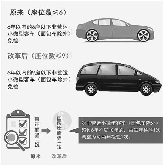 云南车主注意: 11月20日起,私家车年检新政正式实施,年检免检时限和范围都有新变化。 1 扩大机动车免检范围 免检范围扩大: 在实行6年以内6座以下非营运小微型客车免检基础上,将6年以内的7至9座非营运小微型客车(面包车除外)纳入免检范围。 免检周期扩大: 对非营运小微型客车(面包车除外)超过6年不满10年的,由每年检验1次调整为每两年检验1次。即第7年、第9年免检,第8年、第10年正常年检。 注意:面包车、非法改装被依法处罚的车、造成人员伤亡的交通事故的车不享受免检政策。另外,自出厂之日起超过4年未办理登记注册手续的车,不享受6年免检政策。 2 年检时间表 9座以下的非营运小微型客车,使用年限不满10年的,仅需上线检验2次。 10年以上的,仍然按照原规定的检验周期执行,即10-15年的,每年检验一次,15年以上的,每半年检验一次。 在用车第7年已按规定检验的,第8年免检,第9年、第10年需正常参加检验。 在用车第9年已按规定检验的,不享受免检政策,第10年需正常参加检验。 注意:“免检车”不等于“不用年检”,而是免于上线检测。 据云南发布微信公众号