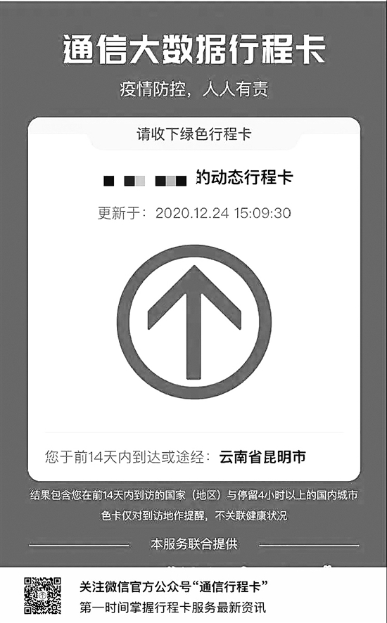 据中国铁路昆明局集团有限公司12月26日消息,按照云南省疫情防控要求,为进一步加大入境人员排查力度,防范非法入境人员造成疫情远端传播风险,自2020年12月20日起,在云南省各宾馆酒店、机场、火车站、长途汽车站、港口出发离滇及公安检查站等重点场所,都要查验“通信行程卡”。也就是说,到昆明站、昆明南站乘车进站时须同时出示云南健康码和通信行程卡。有出行需要的市民可提前申报,避免到站排队拥挤。没有申报“通信行程卡”的市民无需担心,昆明站、昆明南站进站口均设有纸质登记处,市民可前往进行登记。 方法3:下载行程卡App,获取“通信行程卡”。 方法4:发送短信CXMYD到所属运营商(电信10001/移动10086/联通10010)进行查询。 据云南网