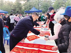 现场,墨香飘逸,人头攒动。一张张象征喜气吉祥的红纸铺散开来,一笔笔苍劲有力的“祝福”跃然纸上,一副副饱含纸墨清香、新年祝福的春联,在警官们的笔下片刻生成,带着西山分局民警浓浓的关怀和深情的祝福,送到辖区居民手中。