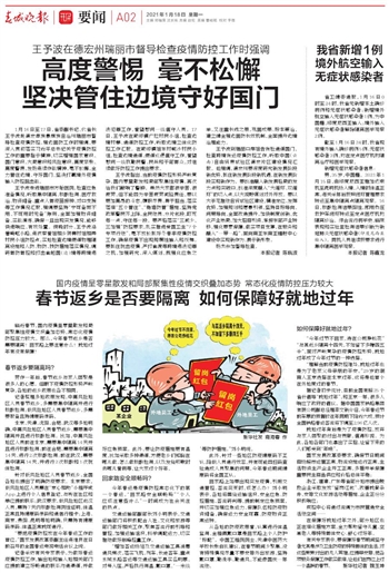 1月16日至17日,省委副书记、代省长王予波赴德宏傣族景颇族自治州瑞丽市督导检查疫情防控、强边固防工作时强调,要深入贯彻落实习近平总书记关于疫情防控工作的重要指示精神,切实增强国家意识、国门意识、大局意识和风险意识,高度紧张、高度警惕,发扬连续作战精神,毫不松懈,全力管住边境、守好国门,坚决打赢境外疫情输入防控阻击战。 王予波走进瑞丽市方舱医院,检查应急准备情况,听取集中隔离、核酸检测、医疗救治、物资储备、重点人群疫苗接种、对口支援等工作情况汇报,强调要坚持“宁可备而不用、不可用时无备”原则,全面加强物资储备、实战演练,确保一旦出现突发情况,能够快速响应、有效处置。傍晚时分,王予波沿着崎岖小路,连夜察看姐相乡贺赛村姐相弄村民小组防控点,实地检查边境便道物理隔离设施和人防、物防、技防措施落实情况,调研群防群控和打击偷越国(边)境等跨境违法犯罪工作,看望慰问一线值守人员。17日,王予波在勐卯镇广拉村民小组,检查边境村寨、通道防控工作,听取边境立体化防控工作汇报。在勐卯镇姐东村喊沙村民小组,检查边境通道、便道巡逻值守工作,看望慰问一线执勤民警、民兵和干部群众,对继续做好防控工作提出要求。 王予波指出,当前疫情防控形势严峻复杂,国内零星散发和局部聚集性疫情,再次给我们敲响了警钟。虽然大家都很辛苦、很疲劳,但不能因为辛苦疲劳减轻责任,要以更加高昂的斗志,履职尽责、勇于担当,落实落细“五个管住”、“稳堵防管”措施,坚持党政军警民齐上阵,全民动员、分片包段,盯死每一点、守住每一段。要严格落实“三减少、三加强”防控要求,扎实推进爱国卫生“7个专项行动”,毫不放松抓好冬春季疫情防控工作,确保疫情不出现规模性输入和反弹。要抓住抗击疫情、严打偷渡等跨境违法犯罪之机,加强研究、深入谋划,既强化应急之举,又注重长远之策,巩固成果、标本兼治,建立健全强边固防长效机制,全面提升边境治理能力。 王予波到瑞丽口岸姐告货检通道国门,检查跨境货运疫情防控工作,听取中国(云南)自由贸易试验区德宏片区建设情况汇报。他强调,德宏州要深度研究新发展阶段新优势,抓住新发展阶段新机遇,在新发展阶段实现新作为。要找准融入新发展格局的发力点和突破口,找准深度融入“大循环、双循环”的切入点,以大视野谋划对外开放。要以大手笔推动自贸试验区建设,精准定位、发挥优势,加强规划和愿景引领,坚持目标导向、问题导向,全面改造提升,加快制度创新,优化产业布局,加大招商引资,承接东部产业转移,强化要素保障,做实项目支撑,在服务和融入“一带一路”、面向南亚东南亚辐射中心建设中实现新作为、展示新形象。 杨杰参加督导检查。 本报记者 陈晓波