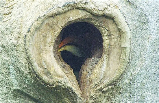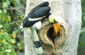 近日,几名自然生态摄影师在盈江县的“中国犀鸟谷”拍摄时,意外记录到了国家一级重点保护野生动物双角犀鸟雌鸟进树洞准备育雏,用大嘴将“爱巢”洞口封闭缩小的影像。 画面中,在树洞里面的双角犀鸟雌鸟不时用大嘴将一些类似泥巴的物质从树洞内衔起来,一遍又一遍地涂抹在树洞壁,就像一个专业的“泥水匠”。当雄鸟飞来喂食时,雌鸟接过果实,把一些浆果也涂抹在树洞壁。在封巢过程中,不时有封巢物质从大嘴掉落,有些涂抹在洞壁的物质也会掉落,雌鸟都会小心翼翼地用大嘴再次衔起。摄影师在两个多小时的拍摄记录中发现,树洞壁两侧已被涂抹出了一层略带潮湿的封洞物质。 据鸟类专家曾祥乐介绍,雌鸟在育雏期间用提前叼进去的泥巴和粪便混合后堆积在洞口,并混合果实、种子和木屑等将洞口封闭,仅留一个小孔让雌鸟嘴端能够伸出。这样封住树洞,就能很好避免在洞内育雏期间受到蛇等其他动物的伤害和影响。本次能够在“中国犀鸟谷”野外记录到封巢的影像,实属难得,填补了双角犀鸟这方面的影像记录空白。 据了解,每年2月底至7月初是双角犀鸟的繁殖期。为了使雌鸟和雏鸟都能得到充足的食物,雄鸟必须一次又一次地飞到外面觅食,食物将从封好的小口递喂给雌鸟和雏鸟。 2021年刚颁布的国家重点保护野生动物名录中双角犀鸟、花冠皱盔犀鸟、冠斑犀鸟同时列入一级保护级别。目前这3种犀鸟仅在云南省盈江县有稳定的观察记录。李发兴 尹以祜 摄影报道