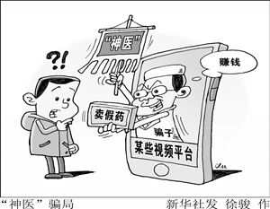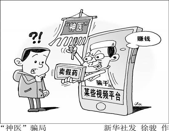 □ 新华社记者 梁建强 当下,短视频平台已成为大家消遣消费的一个重要途径。然而,一些“神医”又开始盯上了这个市场并开始疯狂表演,污染了平台更值得警惕。 在视频平台上劲爆表演的“神医”并非医生,更非来自医学世家,不过是一群“群演”在按剧本演戏而已。“神医”是幌子,卖假药赚钱才是目的。消费者不但钱财被骗,疾病治疗也被耽误。“神医”公然行骗,监管部门必须依法严惩。 打击“神医”骗局,也要高度关注新形势、新变化。在监管部门的打击下,近些年,部分“神医”从电视台的养生类节目中消失,但又开始“转战”视频网络平台,继续招摇撞骗。这也提醒相关部门:打击工作要因时而变、多措并举,让“换了马甲”的违禁广告和骗局无处遁形。 “神医骗局”屡打不绝,根本上还是由于违法收益大于违法成本。进一步完善监管体系、制度和手段,让监管长出“牙齿”,方能形成震慑。同时,短视频平台等也要切实履行好责任,绝不能给“神医骗局”新的可乘之机,必须坚决让这些骗子下线!