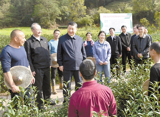中共中央总书记、国家主席、中央军委主席习近平近日在福建考察时强调,要落实党中央决策部署,坚持稳中求进工作总基调,立足新发展阶段、贯彻新发展理念、构建新发展格局,深化供给侧结构性改革,扩大改革开放,推动科技创新,统筹疫情防控和经济社会发展,统筹发展和安全,在加快建设现代化经济体系上取得更大进步,在服务和融入新发展格局上展现更大作为,在探索海峡两岸融合发展新路上迈出更大步伐,在创造高品质生活上实现更大突破,奋力谱写全面建设社会主义现代化国家福建篇章。 仲春时节,八闽大地一派勃勃生机。3月22日至25日,习近平在福建省委书记尹力、省长王宁陪同下,先后来到南平、三明、福州等地,深入国家公园、生态茶园、文物保护单位、医院、农村、企业、学校等,就贯彻党的十九届五中全会精神、推动“十四五”开好局起好步、统筹推进常态化疫情防控和经济社会发展等进行调研。 要坚持生态保护第一,统筹保护和发展,有序推进生态移民,适度发展生态旅游,实现生态保护、绿色发展、民生改善相统一。 武夷山国家公园是首批国家公园体制试点之一。22日下午,习近平来到公园智慧管理中心,察看智慧管理平台运行情况。该中心综合运用智能化技术,实现了对公园“天地空”全方位、全天候监测管理,提升了生态保护能力。习近平对生态文明建设高度重视,在福建工作期间就推动了长汀水土流失治理、木兰溪防洪工程等重大生态保护工程,并于2000年推动福建率先在全国探索生态省建设。经过长期努力,福建生态文明建设取得了积极成效。习近平指出,建立以国家公园为主体的自然保护地体系,目的就是按照山水林田湖草是一个生命共同体的理念,保持自然生态系统的原真性和完整性,保护生物多样性。要坚持生态保护第一,统筹保护和发展,有序推进生态移民,适度发展生态旅游,实现生态保护、绿色发展、民生改善相统一。 武夷山是乌龙茶、红茶的发源地。习近平来到星村镇燕子窠生态茶园,察看春茶长势,了解当地茶产业发展情况。习近平强调,要统筹做好茶文化、茶产业、茶科技这篇大文章,坚持绿色发展方向,强化品牌意识,优化营销流通环境,打牢乡村振兴的产业基础。要深入推进科技特派员制度,让广大科技特派员把论文写在田野大地上。 离开茶园,习近平乘竹筏沿九曲溪察看生态环境保护情况和自然景观。在九曲溪畔的朱熹园,习近平详细了解朱熹生平及理学研究等情况。他指出,要推动中华优秀传统文化创造性转化、创新性发展,以时代精神激活中华优秀传统文化的生命力。要把坚持马克思主义同弘扬中华优秀传统文化有机结合起来,坚定不移走中国特色社会主义道路。 要抓住机遇、开阔眼界,适应市场需求,继续探索创新,在创造美好生活新征程上再领风骚。 近年来,三明医改以药品耗材治理改革为突破口,坚持医药、医保、医疗改革联动,为全国医改探索了宝贵经验。2016年2月,习近平主持中央全面深化改革领导小组会议,听取了三明医改情况汇报,要求总结推广改革经验。23日上午,习近平来到三明市沙县总医院,在住院楼一层大厅听取医改情况介绍,向医护人员、患者了解医改惠民情况。习近平强调,人民健康是社会主义现代化的重要标志。三明医改体现了人民至上、敢为人先,其经验值得各地因地制宜借鉴。要继续深化医药卫生体制改革,均衡布局优质医疗资源,改善基层基础设施条件,为人民健康提供可靠保障。 福建发扬习近平在宁德工作时提出的弱鸟先飞、滴水穿石精神,下大气力抓摆脱贫困。经过30多年努力,福建全省同全国一道,彻底消除了绝对贫困。23日下午,习近平来到革命老区村——沙县夏茂镇俞邦村,在小吃摊边、特产店里、村民家门前,同乡亲们亲切交谈,详细了解沙县小吃发展现状和前景。习近平指出,沙县人走南闯北,把沙县小吃打造成了富民特色产业。乡村要振兴,因地制宜选择富民产业是关键。要抓住机遇、开阔眼界,适应市场需求,继续探索创新,在创造美好生活新征程上再领风骚。 习近平在福建工作时推动开展了集体林权制度改革,试行“分山到户、均林到人”,实现“山定权、树定根、人定心”。在沙县农村产权交易中心,习近平听取集体林权制度改革介绍,向办事群众和工作人员了解集体林地经营权流转交易、不动产登记等情况。习近平指出,三明集体林权制度改革探索很有意义,要坚持正确改革方向,尊重群众首创精神,积极稳妥推进集体林权制度创新,探索完善生态产品价值实现机制,力争实现新的突破。 要坚持创新在现代化建设全局中的核心地位,把创新作为一项国策,积极鼓励支持创新。 习近平24日在福州考察调研。在福州工作期间习近平领导实施了福州市“3820”工程,勾画跨世纪福州现代化建设宏伟蓝图。在福山郊野公园,习近平乘坐电瓶车实地了解郊野福道风貌,他登上观景平台,远眺福州新貌,听取城市生态公园规划建设、城市水系综合治理情况汇报。市民们看到总书记来了,争相围拢过来。习近平指出,建设好管理好一座城市,要把菜篮子、人居环境、城市空间等工作放到重要位置切实抓好。福州是有福之州,生态条件得天独厚,希望继续把这座海滨城市、山水城市建设得更加美好,更好造福人民群众。 福州三坊七巷历史文化街区保留了唐宋遗留下来的坊巷格局和大