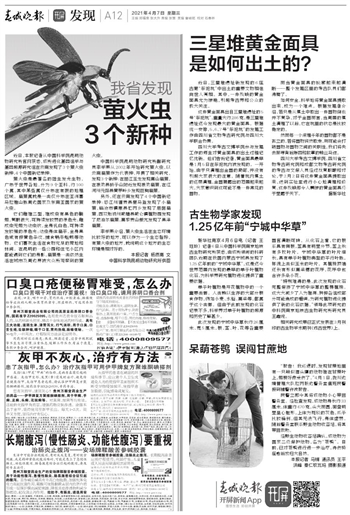 近日,本报记者从中国科学院昆明动物研究所官网获悉,该所进化基因组学与基因起源研究组在云南发现了3个萤火虫新种、4个中国新纪录种。 萤火虫是最著名的陆生发光生物,广布于世界各地,分为9个亚科、约100个属,其中某些属仅分布在有限的地理区域。扁萤属就是一类仅分布在亚洲喜马拉雅山脉周边国家及东南亚国家的萤火虫。 它们雌雄二型,雄成虫有黑色的鞘翅,复眼很大,可持续发较弱的绿色光;雌成虫无翅为幼虫状,全身乳白色,可持续发较强的绿色光;幼虫身体扁平,全身黑色或有棕黄色条纹,捕食蜗牛蚯蚓等动物。它们喜欢生活在食物充足的荒地和林间。在昆明的一些公园和住宅小区内都能遇到它们的身影,扁萤是一类依然生活在城市及周边易被大众所观察到的萤火虫。 中国科学院昆明动物研究所副研究员李学燕从2002年开始研究萤火虫,以云南扁萤作为代表种,开展了相关研究,发现3个新种:在丽江玉龙发现高山扁萤,在禄劝县轿子山附近发现禄劝扁萤,在红河州元阳县黄茅岭乡发现巨胸扁萤。 另外,还在云南发现了4个中国新纪录种:怒江州福贡县鹿马登发现了小扁萤、临沧市镇康县忙丙乡发现了扇窗扁萤、西双版纳州勐腊县勐仑镇植物园发现了尼泊尔扁萤、高黎贡山赧亢发现了黑泽扁萤。 李学燕介绍,萤火虫生活在生态环境比较好的地方,可以作为一个生态指标。有萤火虫的地方,就说明这个地方的生态环境是相对好的。 本报记者 杨质高 文 中国科学院昆明动物研究所供图