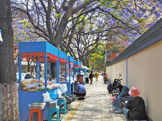 近日,昆明教场中路的蓝花楹在微信朋友圈刷屏了。昨日记者途经此地时,发现专程来此处赏花的人不少,纷纷拿出手机或相机驻足拍照。而随着人气的增加,这条道路上也出现了一些小摊点。五华区城管中队的一名工作人员介绍,这是他们今年首次推出的举措,满足市民、游客需求的同时,增加就业机会。 春景、人流,除了这一道道风景线,整齐划一地分布在路边的小摊点也格外引人注目。在这里,凉米线、豌豆粉、凉面等特色小吃应有尽有,瓶装饮料、鲜榨果汁等各种饮品齐上阵,让赏蓝花楹之行更为惬意。此外,也有小饰品摊点,上面陈列着玉、石头等饰品,吸引了一些年轻人前来挑选。 现场,记者从五华区城管中队的一名工作人员处了解到,这里的临时摊位是经政府部门审批同意而设置的,为期两个月,一共有20个。市民租下后可以转租,目前只剩下3个摊位。“在这里设置临时摊位的目的,是为前来赏花的市民、游客提供饮食服务,同时可以帮助一部分人就业,一举两得。”该工作人员说,“每天都有城管人员在这儿上岗,负责人流通行,进行现场监督,不会造成人行道的阻塞。” 一位摊主告诉记者,一个摊位的租金为1500元/月。 本报记者 左学佳 摄影报道