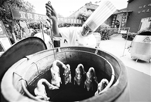 宜良烤鸭香飘万里、远近闻名,烤鸭产业已经成为宜良重要的支柱型富民产业。4月26日,宜良县总工会2021年职工技能竞赛启动仪式暨全县烹饪(全鸭宴、烤鸭制作)技能竞赛举行。 一声令下,比赛开始。参赛职工选手以饱满的热情投入技能竞赛。鸭经过洗净、煮沸、无尘风干、蜂蜜上色后,由选手们娴熟焖烤。不一会儿,浓浓的烤鸭香扑面而来,令人口舌生津、馋涎欲滴。 宜良县委副书记吴智峰介绍,作为全国四大养鸭县之一,宜良鸭产业历史悠久、文化底蕴深厚,具有群体覆盖广、经济拉动大、社会贡献多等特点。2020年全县鸭养殖规模达到1800万羽,一产产值4.9亿元,占农业总产值的9%,目前已形成一条饲料生产—养殖—屠宰—系列制品深加工—餐饮旅游的全产业链,直接、间接带动从业人员近6万人,是宜良农业产业中重要的支柱型富民产业,有效推动了乡村振兴建设步伐。本报记者 龙宇丹 摄影报道