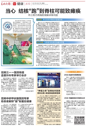 据权威数据统计:血管疾病中下肢静脉曲张、脉管炎、静脉血栓占90%以上,严重影响百姓生活质量,甚至危及生命健康。 值此“五一”劳动节之际,昆明三一一医院特邀中华医学会血管外科分会张铠、成含平专家来五华区西坝路院区举行会诊活动。会诊时间5月1日至7日,此次会诊专家引用美国EVLT微创介入技术、德国负压封闭引流技术,为广大下肢静脉曲张、复发性静脉曲张、脉管炎、下肢动静脉血栓患者带来十分难得的康复机会。会诊期间:免专家挂号费、会诊费,治疗费最高减免2000元,有下肢血管疾病的患者可直接到院咨询就诊。 本报记者 陶彦然