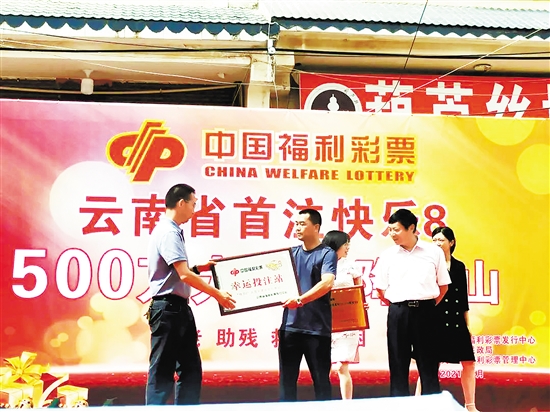 5月11日,云南省福彩中心副主任桂军、文山州民政局局长尚元超为2021年云南省首注“快乐8”游戏500万大奖中奖销售网点颁发奖牌。 中国福利彩票“快乐8”游戏第2021114期于5月4日晚开奖,当期全国仅产生1注“选十中十”500万元头奖,该注头奖出自文山市龙海路83号53071841号福彩销售网点,该网点一彩民以一张10元的“选十”玩法单式票斩获1注一等奖,揽获奖金500万元。 “快乐8”游戏在我省试点上市以来,因其返奖率高、单注奖金大、全中有大奖、不全中也有奖、全不中可能还有奖等玩法特点吸引了许多彩民。截至目前,文山州共有223家福彩销售网点开通销售“快乐8”游戏,迄今已销售600余万元。 当天,为让市民体验购彩乐趣,增强参与感,扩大福利彩票的宣传范围,文山州福彩中心在现场组织了小型刮刮乐即开票卖场,吸引了不少市民。