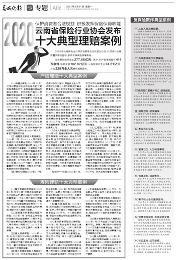 2020年云南保险业以保护消费者合法权益为己任,以促进行业高质量发展为目标,积极发挥保险保障职能。 全年累计赔付支出277.68亿元。其中,财产险理赔案件414万余件,赔款金额182.87亿元;人身险赔付支出94.81亿元,共为229万余人次提供理赔服务。 产险理赔十大典型案例 (一)种植业保险:2019年12月,红河州蒙自市发生历史罕见的大面积持续霜冻天气,枇杷种植户面临巨额经济损失。平安财险云南分公司理赔专案组连续28天查勘,与853户受灾农户逐一完成赔款分户签字确认及理赔资料收集,于2020年1月22日完成所有案件系统结案,总计赔付3033.36万元。充分体现农业保险“保险为民,服务三农”的宗旨。 (二)财产综合险:2020年7月,诚泰财险云南分公司与昆明市官渡区小板桥街道办事处新源物资交易市场火灾事故中的受灾户签订完损失确认书后,48小时内完成1461.2万元赔款支付工作。此案件是昆明市近年来过火面积比较大的一起火灾,彰显了理赔时效性。 (三)道路客运承运人责任保险:2019年12月,云A1×××网约车在昭通市大关县黄金坝附近行驶时发生侧翻,造成车辆严重受损,车上1死5伤的单方交通事故。太保财险云南分公司利用云、川两地的理赔资源立即组成事故应急处理小组,通过专享赔人伤探视、主导协商、陪同鉴定、减免单证等一系列暖心服务,最终被保险人获得267.23万元赔付。快速处置重特大交通事故,缓解社会矛盾,具有很好的示范性作用。 (四)森林火灾保险:2020年3—7月,红河州多处公益林、商品林发生火灾,诚泰财险云南分公司及时跟进了解受损情况,9月份完成定损后支付赔款119.5万元。彰显保险扶农助农保障,助力受灾林木复种。 (五)机动车辆保险:2020年8月,标的车操作不当与道路旁摆摊人员发生碰撞,造成2死1伤,车辆受损。被保险人为建档立卡户,为避免出现脱贫后返贫情况,阳光财险云南分公司开通绿色通道,第一时间完成查勘和案件调查,预付死者丧葬费和伤者医疗费,组织调解赔付113.35万元。为建档立卡户开通绿色理赔通道,获得客户和当地政府的高度认可。 (六)非义务教育校方责任保险:2018年4月,昭通市某中学一学生因篮球架倒塌,头部受伤,身体多处机能受损,在多家医院进行长达220天的住院治疗。由于伤者为留守儿童,独自带着弟弟在镇上求学,太保财险云南分公司充分体现无微不至人伤服务,开通预付绿色通道,及时解决学校资金问题。在疫情影响法院迟迟未能立案的情况下,派遣理赔人员代表学校参与调解,最终达成90万元的赔付金额。为伤者开通绿色通道,主动参与调解,人性化理赔获得客户认可。 (七)财产一切险:2020年5月,怒江州贡山县境内普降暴雨,造成泸水至贡山沿线中国电信通信线路严重受损。人保财险云南省分公司积极配合被保险人采用先恢复后定损方式,有效解决定损与限时恢复通信的矛盾,赔偿金额157.08万元。有效处置公共服务行业事故,体现一切为人民的服务理念。 (八)国内水路、陆路货物运输保险:2020年8月,货运车辆行至保山杭瑞高速K2776段时,挂车右后中桥轮胎起火,导致承运卷烟734万支受损。人保财险云南省分公司共赔付288.25万元。践行保险重合同守信用的理念。 (九)工程险:2020年4月,高速公路施工人员巡查发现坡口开裂,且裂痕不断扩大。平安财险云南分公司组织专业人员查勘,核实保险责任,简化理赔资料,于12月1日达成一致后次日即支付253.9万元,及时缓解项目资金紧张问题。理赔及时,为工程建设保驾护航。 (十)财产综合险:2020年1月,陆良县突降暴雪,造成厂房垮塌,导致原材料、半成品等设备物资受损。事逢春节和疫情,人保财险云南省分公司及时清点核实受损财产,在双方对赔偿金额认定出现分歧的阻力下,达成诉讼期间庭内和解,赔偿金额360万元。依法合规处理争议案件。 寿险理赔十大典型案例 (一)重大疾病和医疗保险:2020年3月,张女士因“双耳传导性耳聋”多次住院治疗,最终诊断为“双耳听力极重度聋”。太平人寿云南分公司赔付了198.8万元重大疾病保险金,并豁免子女5张保单后期保险费约67.4万元。保险为自己解决后期治疗的费用,同时为家人提供了保障。 (二)团体意外伤害保险和医疗保险:2020年1月,余先生工作中因摔倒造成闭合性脑损伤,公司为员工购买团体意外险和意外医疗险,中国人寿云南分公司赔付了110.77万元保险金。单位为员工提供一份意外保障。 (三)重大疾病保险: 2020年10月,赵姓小朋友被诊断为病毒性脑炎、重型手足口病,太平洋人寿云南分公司赔付了重大疾病保险金101.3万元。重大疾病保险发生无年龄区别,保险为你提供保障。 (四)意外伤害保险和人寿保险:2017年11月,邓先生开车前往工作地途中失联,2020年5月法院判决宣告死亡。华夏人寿云南分公司按身故保险责任赔付了100万元。长期失联,根据法院宣告死亡进行赔付,获得家人的高度认可。 (五)重大疾病保险:2020年8月,陈先生确诊了右侧甲状腺乳头状癌,平安人寿云南分公司赔付重大疾病保险金540万元。个人保险意识强,保险为后期治疗和生活提供了充分的资金保障。 (六)意外伤害保险和人寿保险:2020年3月,张女士乘车发生交通意外抢救无效死亡,人民人寿云南分公司赔付给保单指定受益人291万元定期寿险和意外伤害保险金。风险无处不在,每个人都应提高保险意识。 (七)重大疾病和医疗险:2020年6月,谢女士确诊为右侧甲状腺恶性肿瘤和颈
