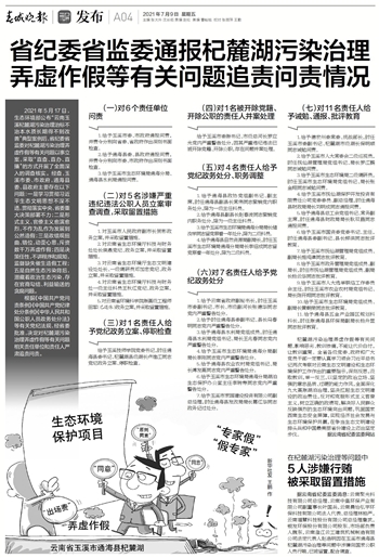 2021年5月17日,生态环境部公布“云南玉溪杞麓湖污染治理治标不治本水质长期得不到改善”典型案例后,省纪委省监委对杞麓湖污染治理弄虚作假等有关问题以事立案,采取“直查、直办、直播”的方式开展了全面深入的调查核实。经查,玉溪市委、市政府,通海县委、县政府主要存在以下问题:一是学习贯彻习近平生态文明思想不深不透,贯彻落实中央、省委重大决策部署不力;二是形式主义、官僚主义愈演愈烈,不作为乱作为发展到公然造假;三是政绩观扭曲、错位,动歪心思,斥资数千万弄虚作假;四是决策任性,不讲程序和规矩,监督缺失催生造假工程;五是自然生态污染背后,潜藏着政治生态污染,存在官商勾结、利益输送的贪腐问题。 根据《中国共产党问责条例》《中国共产党纪律处分条例》《中华人民共和国公职人员政务处分法》等有关党纪法规,经省委批准,决定对杞麓湖污染治理弄虚作假等有关问题相关责任单位和责任人严肃追责问责。 (一)对6个责任单位问责 1.给予玉溪市委、市政府通报问责,并责令分别向省委、省政府作出深刻书面检查。 2.给予通海县委、县政府通报问责,并责令分别向市委、市政府作出深刻书面检查。 3.给予玉溪市生态环境局通海分局、通海县水利局通报问责。 (二)对5名涉嫌严重违纪违法公职人员立案审查调查,采取留置措施 1.对玉溪市人民政府副市长贺彬政务立案,并采取留置措施。 2.对云南省生态环境厅科技与财务处处长侯鼎党纪、政务立案,并采取留置措施。 3.对云南省生态环境厅生态文明建设处处长、一级调研员邓加忠党纪、政务立案,并采取留置措施。 4.对云南省生态环境厅科技与财务处一级主任科员王秋红党纪、政务立案,并采取留置措施。 5.对云南省环境科学院原高级工程师田军(已退休)政务立案,并采取留置措施。 (三)对1名责任人给予党纪政务立案、停职检查 给予玉溪技师学院党委书记,时任通海县委书记、杞麓湖县级湖长卢维江同志党纪政务立案、停职检查。 (四)对1名被开除党籍、开除公职的责任人并案处理 给予玉溪市委原书记、市级总河长罗应光党内严重警告处分,因其严重违纪违法已被开除党籍、开除公职,存在问题并案处理。 (五)对4名责任人给予党纪政务处分、职务调整 1.给予通海县政协党组副书记、副主席,时任通海县副县长常伟同志撤销党内职务处分,降为一级主任科员。 2.给予通海县副县长赵春波同志撤销党内职务处分,降为一级主任科员。 3.给予玉溪市生态环境局通海分局局长储汝学同志留党察看一年处分,降为二级科员。 4.给予通海县自然资源局副局长,时任玉溪市生态环境局通海分局局长李绍成同志留党察看一年处分,降为二级科员。 (六)对7名责任人给予党纪政务处分 1.给予云南省政府副秘书长,时任玉溪市委副书记、市长、市级副河长张德华同志党内严重警告处分。 2.给予时任通海县委副书记、县长马春明同志党内严重警告处分。 3.给予通海县水利局党组成员,时任通海县水利局党组书记、局长王兆春同志党内严重警告处分。 4.给予玉溪市生态环境局通海分局副局长李刚同志党内严重警告处分。 5.给予通海县农业农村局党组书记、局长溥发高同志党内严重警告处分。 6.给予玉溪市生态环境局通海分局湖泊生态保护办公室主任李转寿同志党内严重警告处分。 7.给予玉溪市家园建设投资有限公司副总经理,时任通海县发改局局长葛红华同志政务记过处分。 (七)对11名责任人给予诫勉、通报、批评教育 1.给予德宏州委常委、统战部长,时任玉溪市委副书记、杞麓湖市级湖长保明顺同志诫勉问责。 2.给予玉溪市人大常委会二级巡视员,时任抚仙湖管理局党组书记、局长罗江鹏同志诫勉问责。 3.给予玉溪市生态环境局二级调研员,时任玉溪市生态环境局党组书记、局长张金翔同志诫勉问责。 4.给予玉溪市抚仙湖保护开发投资有限责任公司党委委员、副总经理,时任通海县财政局局长刘明成同志通报问责。 5.给予通海县总工会党组书记、常务副主席,时任通海县财政局局长耿双昌同志通报问责。 6.给予玉溪市国资委党委书记、主任,时任通海县委副书记、县长柳洪同志批评教育。 7.给予玉溪市抚仙湖管理局党组成员、副局长施纯律同志批评教育。 8.给予玉溪市政务管理局党组成员、副局长,时任市抚仙湖管理局党组成员、副局长杨云华同志批评教育。 9.给予玉溪市人大选举联络工作委员会主任,时任玉溪市农业农村局党组书记、局长陈开翔同志批评教育。 10.给予玉溪市生态环境局党组成员、副局长黄朝荣同志批评教育。 11.给予通海县五金产业园区规划科科长,时任原通海县环保局副局长杨升显同志批评教育。 杞麓湖污染治理弄虚作假等有关问题,影响恶劣、教训惨痛,不能让代价白付,让教训重复。全省各级党委、政府和广大党员干部一定要认真学习领会习近平总书记两次考察对云南生态文明建设和生态环境保护工作作出的重要指示,深刻反思,汲取教训,举一反三,以坚定的政治立场、坚强的意志品质、过硬的能力作风,全面深化九大高原湖泊治理,坚决扛起生态文明建设的政治责任,反对和克服形式主义官僚主义,树立正确的政绩观,解决好人民群众反映强烈的生态环境突出问题,巩固国家西南生态安全屏障,实现经济社会发展与生态环境保护共赢,在争当生态