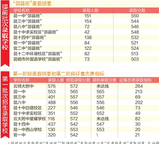 7月8日,2021年昆明中考提前批次和第一批次一级一等高(完)中估分填报志愿录取分数线出炉。 昆明市招生考试院发布录取公告,公布了提前批次录取学校“民族班”“阿诗玛班”以及“郊县班”“空乘特色班”录取结果,同时公布了主城区第一批次招生录取学校第一阶段估分填报志愿录取结果和第二阶段征集志愿指标,定向择优生录取分数,以及可参加征集志愿录取的主城区考生分数段。考生可登录“昆明市学考网”(www.kmzky.cn)查询本人的录取状态。 提前批次录取学校中,“民族班”“阿诗玛班”录取学校均完成招生计划,最低录取分出现同等分时,超计划投档录取;昆三十中“空乘特色班”剩余招生计划6人,调整为普通高中招生计划,安排在第三批次征集志愿阶段录取,其余录取学校均完成招生计划,最低录取分出现同等分时,超计划投档录取。 第一批次录取学校第一轮征集志愿填报时间为7月8日15:00—9日11:00。凡尚未被普通高中学校录取,且考分为500分及以上的主城区考生,可参加征集志愿招生学校的录取;凡尚未被普通高中学校录取,且考分为500分及以上的郊县区考生,可参加面向全市招生学校征集志愿的录取。 参加征集志愿的考生,均须登录“昆明市学考网”(www.kmzky.cn),在征集志愿招生学校中重新选择1—2所填报征集志愿,并于7月9日11:00前,到报考点所属县(市)区招办确认志愿信息。未按时确认签字的志愿信息视为无效。 第一轮征集志愿录取结束后,将公布各招生学校本轮征集志愿录取分数及人数。若还有未完成的招生指标,则公布剩余征集志愿指标数、可参加第二轮征集志愿录取各分数段人数。考生第二轮征集志愿填报时间为9日15:00—10日11:00。 昆明市2021年普通高中招生录取工作,从7月8日开始,到7月25日全部结束。今年,昆明市普高学校招生仍统一实行网络录取,根据学校招生指标,依据考生填报志愿、升学成绩择优录取,已投档录取的考生,不得重复录取。主城区普通高中学校第一、二、三批次学校录取时,采取“估分填报志愿和见分征集志愿”相结合的录取办法。 每一批次每一阶段录取结束后,考生可登录“昆明市学考网”(www.kmzky.cn)查询本人录取情况、各招生学校录取分数、征集志愿录取指标数和可参加征集志愿录取各分数段人数。 (提前批次录取学校“民族班”“阿诗玛班”录取结果以及“空乘特色班”录取结果,定向择优生录取分数、可参加征集志愿录取的主城区考生分数段可登录开屏新闻客户端查看) 本报记者 李思家