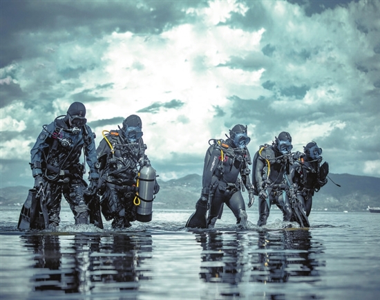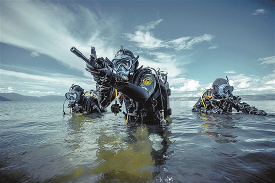 不久前,10名“云豹”突击队员经过严格的选拔考核,从众多精英中脱颖而出,组成了一支全新的水下反恐精锐力量——昆明市公安局特警支队云豹突击大队“蛙人”小组。他们因执行任务时配有形似青蛙脚形状的脚蹼,所以被称为“蛙人”。他们既是潜水员也是突击队员,不仅要有过硬的潜水技能,也要具备超强的特战技能。