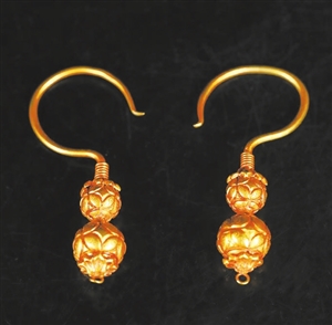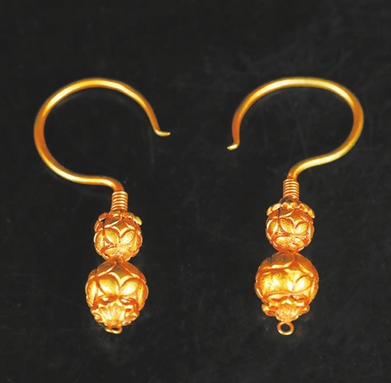 □ 胡萍 很多女人喜欢耳环,戴上后瞬间能让人变美,起到画龙点睛的作用。《陌上桑》里,“耳中明月珠”的罗敷让男人为之倾倒;唐代罗隐在《杂咏》诗里描写游春女子“金环耳际摇”;《孔雀东南飞》的刘兰芝是“耳著明月珰”。耳环小巧玲珑,精致娇丽,彰显着女性的妩媚温柔。过去女人出嫁必备“三金”,其中就有金耳环。 耳环又称耳坠,最初叫珰,系耳饰,是古代女子常戴在耳朵的饰品,有两千多年的历史了。东汉刘熙《释名》中说穿耳施珠为珰,兴于蛮夷,盛于华夏。关于佩戴耳环的由来,有两种说法,第一种认为耳环的出现,是人们对美的追求所产生的;另一种说法是,耳环最初是用于治病,对此,还有一个有趣的故事。 相传古代有一位患眼病的姑娘,双目失明了。后来,一位名医用银针在她两侧耳垂中各刺一银针后,奇迹出现了,姑娘重见光明。姑娘非常感激,于是请银匠精制一对耳环戴在耳上,以示永不忘记名医之恩。当姑娘戴上银耳环后,她日益眉清目秀,并逢人传诵名医的声名。穿耳戴环能明目的奇迹相继传开以后,许多富裕人家的姑娘和妇女都纷纷穿耳戴环,并流传到今,成为高贵身份的象征。 耳环的材质一般以金属、金属与珠宝玉石组合为主,在现今还有用塑料、玻璃制成的。其款式多种多样,有环状的,有花卉形的,有垂吊式的,有链条款的,还有水滴状的。或小巧玲珑,或雍容华贵,或别致新颖,或端庄华丽。女人们戴上精美的耳环,方寸耳间立即大放光彩,让人赏心悦目。 笔者收藏有一对明代的葫芦金耳环,系纯金打造,器型优雅,金光灿灿,玲珑别致。葫芦上小下大,高6.4厘米,最宽处2.8厘米,重22克(一对)。耳环主体用金片锤揲,再錾刻出铜钱形空心束腰的葫芦形,铜钱表面有用虚线连成的卷曲纹。葫芦顶部和尾部各焊接一朵八瓣花形金片,顶部花形金片连着穿戴用的细长弯钩,尾部花形金片上连着一细圆环。整器包浆浓厚,皮壳老道,凹凸有致,纹饰清新自然、錾刻技艺高超,显得精美雅致,富贵大气。其制作工艺采用锤揲、錾刻、剪片、弯片、焊接、锉磨、抛光等。 葫芦是一种很古老的蔓生植物,除实用功效外,因其形状似“吉”字,故而常被寓以“吉祥”之意;葫芦谐音“福禄”,亦常用于祈福;葫芦藤蔓绵延饱满多籽,又象征着子孙众多。明代匠人把葫芦的样式应用于金耳环制作中,其寓意不言而喻。闲暇时品赏这对葫芦金耳环,不但能感受到明代细金工艺的精湛,也能从中领略到中国古代女性耳畔的一抹流光。