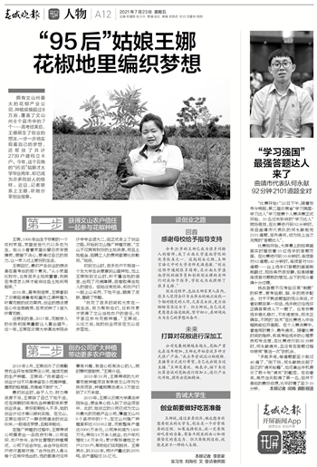 拥有文山州最大的花椒产业公司,种植规模超过8万亩,覆盖了文山州8个县市中的7个……高考结束后,王娜萌生了创业的想法,一步一步地实现着自己的梦想,还帮扶了共计2739户建档立卡户。今年,这个云南的“95后”姑娘才大学毕业两年,却已成为许多同龄人的榜样。近日,记者联系上王娜,听她分享创业故事。 第一步 获得文山农户信任 一起参与花椒种植 王娜,1996年出生于弥勒的一个农村家庭,家里世世代代以务农为生。她从小看着家里长辈日夜辛苦操劳,便暗下决心,要通过自己的努力,让一家人过上更好的生活。 王娜回忆,最初产生创业的想法是在高考后的那个夏天。“从小家里比较穷,也有很多土地闲置着,我就在考虑怎么样才能将这些土地利用起来。” 2015年,高考刚结束,王娜看到了云南昭通鲁甸和重庆江津种植九叶青花椒的成功案例,创业的想法便在心中生根萌芽,在家试种了3亩九叶青花椒。 没想到的是,2017年,花椒惊人的长势和挂果量都让人喜出望外。这一年,王娜在云南大学滇池学院会计学专业读大二,但正式走上了创业之路,开始到文山推广种植花椒。“文山不仅拥有较好的土地资源,而且土地租金、招聘工人的费用都要比弥勒低。”她说。 初到文山时,很多农户不相信一个女大学生会愿意到山里种地,加上王娜刚到文山时,听不懂当地的语言,出现了沟通障碍,很难取得当地人的信任。但她没有放弃,和农户们一起上山采药、下地干活,晒黑了皮肤、磨破了布鞋。 “我花了很多时间和大家在一起生活,努力帮助他们,日积月累才获得了文山当地农户的信任,终于答应参与花椒种植。”王娜说。从这之后,她的创业项目在文山逐步落地。 第二步 创办公司扩大种植 带动更多农户增收 2018年2月,王娜创办了云南勤劳农业开发有限责任公司,继续花椒的生产种植。王娜说:“我希望这一创业计划不只是停留在小范围种植、售卖的格局里,而是能不断扩大。” 最初创业时,由于人力、财力等资源不足,王娜除了自己下地干活,还在闲暇时间寻找各种兼职来积累创业资金。幸好前期投入不多,她的创业计划才得以顺利实施。在文山,王娜也结识了一群志同道合的创业伙伴,一起追逐梦想,且越来越近。 在推广种植的过程中,王娜带领公司摸索出一条政府引导、公司组织、农户参与、合作社管理的种植模式。公司下设合作社,由合作社和农户进行直接对接。“合作社的人是从每个区域中选出的,选的都是对这件事有兴趣、有信心和有决心的人,同时要吃苦耐劳。”王娜介绍。 2018年10月,王娜带领的九叶青花椒种植项目有幸被文山市列为扶贫项目,种植规模迅速从3万亩达到了8万余亩。 2019年,王娜从云南大学滇池学院毕业,便全身心投入到了创业项目中。此时,她创立的公司已成为文山州最大的花椒产业公司,覆盖文山州8个县市中的7个,在文山州推广种植面积达83108.2亩,花椒整体产值达8900万余元,公司净利润为1400万元;带动3.8万余人就业,农户年均增收1.6万余元;累计帮扶建档立卡户2739户,帮助他们实现脱贫。王娜表示,到2022年,预计产量达到2976吨,总产值超过3.5亿元。 谈创业之路 回首 感谢母校给予指导支持 今年25岁的王娜已成为很多同龄人的榜样,成了云南大学滇池学院的优秀校友之一。谈起创业之路,王娜言语之中对大学老师充满感激。“创业过程中遇到很多困难,是云南大学滇池学院的辅导员和创新创业课的老师们对我给予指导,学校也为我提供了很多支持。” 创业过程中,包括王娜家里人在内,很多人觉得会计专业毕业的她应该找一个相对稳定的工作,尤其是女孩,更应该踏踏实实过日子。但王娜说,自己还是更愿意去接受挑战,坚守初心,在田间地头为自己的梦想而奋斗。 未来 打算对花椒进行深加工 公司发展规模越来越大,花椒产量也在逐年增加,王娜也开始尝试多种方式推广产品。“我去年尝试过以短视频、直播等方式进行带货,自己也出镜当过主播。”王娜笑着说。她表示,接下来还打算尝试对花椒进行深加工,进行产业化升级,提炼出花椒精油。 告诫大学生 创业前要做好吃苦准备 王娜说,通过亲身经历,她也想告诉想要创业的大学生,创业是一个非常艰苦的过程。如果选择创业,就一定要做好吃苦的准备,有奋斗到底的决心和顽强坚定的意志力。但只要做到这些,就能走出不一样的人生路。 本报记者 李思家 实习生 刘海伦 文 受访者供图