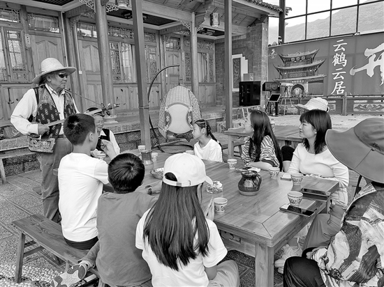 7月29日是大理非遗研学营的第三天,记者和研学营成员们离开烟雨笼罩的剑川,穿过鹤庆东马厂万亩洋芋花海,来到新华村银器小镇。通过看鱼鹰表演、了解银器锻制工艺流程、听白族小三弦,记者看到成员们成了恬静的观察者、感受者。 弦音恒久 用白族话唱出乐曲魅力 新华村的五龙河上,刚好能容纳15人左右的木船上,两位身着民族服饰的五十来岁奶奶一前一后,将木桨娴熟地划起来。小船悠悠地穿过石桥,逐渐迈入开阔处,船舷边的水草清透可见,河面上约两米高的绿色芦苇成片在微风中摇摆,与远山一同构建了一幅美景。 转瞬,这醉人的美景中,一艘小船忽然出现,上演一场“稳、准、狠”的“生死角逐之战”。两位训鹰人精瘦黝黑,船上10只鱼鹰蓄势待发。突然鱼鹰一头猛扎进河中,三两分钟后,一只健美的白色鱼鹰嘴衔一条大鲤鱼破水而出,博得船上一阵欢呼喝彩。 同样让成员们觉得无限美好的,是一曲省级非遗传承人张树先弹奏的白族小三弦,以及他唱的悠扬动人的田埂调。从小因病双目失明的张树先凭借自己弹奏小三弦的出色技艺和动听的田埂调唱腔,虏获了爱人的心,流传为一段佳话。张树先弹奏起白族小三弦,欢快、清亮的音色让每个人都屏息聆听,一曲下来掌声不断。唱田埂调时,地道的白族话里散发着满满的民族乐曲的魅力。钢琴八级、古筝十级的阿敏全程互动,阿敏说:“曲调的美是可以跨越语言而直抵心灵的,纵使不会弹小三弦,有生之年能有一次这样的聆听,对我而言有着莫大的、难以言说的感动。” 不可思议 银壶是用银片敲打成的 “仅仅一块银片真的可以敲打成为一个银壶吗?”小航张大了嘴巴问道。在银匠村银器锻制技艺国家级代表性传承人寸光伟的工作室里,研学营成员们对于日常早已见惯的银器有了完全不一样的认识。 寸光伟对锻制银器的工具、工序等进行了介绍,最让成员们惊叹的是一块银片经过不断敲打,最后可以做成一把银壶,“平常大街小巷见过很多银壶,但是没有想过它是怎么做出来的,看到展示架上从银片到银壶的锻制过程,觉得十分不可思议。”小航说。 听完讲解后,成员们纷纷拿着铜器上手尝试,看着师傅做起来简单,自己上手却完全是另一码事。一向喜欢手工的小姝说:“每敲一下的位置、轻重都影响着铜器的形状和肌理。” “小孩子在短时间内可能做不好,但是至少让他们有足够的时间去了解这个行业的历史渊源、工艺流程,亲手做一个戒指、手镯等简单的作品。”寸光伟告诉记者:“学生的学习通常更纯粹,更关心‘是什么?为什么?怎么做?’非遗研学非常契合我们想要传播银器锻制工艺文化的初心,是在他们充满好奇与求知欲的心里埋下银器锻制的种子,这将会是一种很好的传承。” 临走前,涵涵正入迷地看着展柜内精致的银器,不知道那一刻,是什么样的美偷偷溜进了她的心里…… 本版稿件由本报记者 刘文波 摄影报道