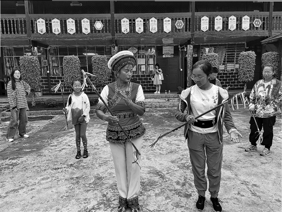 大理非遗研学日记4 7月31日,本次大理非遗研学营的行程全部结束,成员们依依惜别。有成员在微信朋友圈里写道:我是大理人,经过此次研学游,重新认识了大理的美。这种美蕴含在苍山,蕴含在洱海;在扎染里,泥塑里,木雕里;还在银器的千锤百炼中,布扎的一针一线中……非遗传承人将大理的美融入了作品。 7月30日至31日,研学营成员们在周城蓝续百年举人院学习国家级非物质文化遗产扎染技艺、在庆洞村委会跟霸王鞭省级代表性传承人何松康学习霸王鞭、在剪纸省级代表性传承人杨慧英家中学习剪纸。 霸王鞭以竹竿两头开缝,穿以铜钱,演出时持竿,用两端抨击肩背、腿、脚踝等部位发声。何松康说,她从爷爷那里学来的霸王鞭共有23个动作,这些动作来源于田间劳作,有扛锄头、挖田、撒播、割谷子、背谷子等。每当节庆日,尤其是绕三灵时,何松康便会应邀表演霸王鞭。她表演霸王鞭时,俨然一个在田间小憩间隙,拿着农具起舞的劳动者。成员然然说:“祖先们既会劳动,又会生活!”据了解,来向何松康学习霸王鞭的人不少,她现在已经教会了1000多人。 蓝续扎染小院的主人小白因为想要将扎染延续下去,因而将小院叫做“蓝续”,还创造了同名品牌,小院里你来我往的扎染体验者来自全国各地,他们将这种美带回了家乡。 苏龙祥的泥塑工作室迎接着一批又一批的体验者,他正联络大理市残疾人联合会为有需要的人提供免费培训。 银器非遗传承人寸光伟说,鹤庆县银器从业者有上万人,而他的工作室内大多都是年轻人,充满了活力。 段四兴的木雕工作室现已培训300余人。前来参加培训的四川大学艺术学院教授赵志红告诉记者:“剑川木雕极具民族特色,技法精湛,这些手艺不能失传。云南还有许多非遗项目,非遗传承人在创作,同行者在学习,非遗体验面向大众,一切都在促就非遗传承。”本报记者 刘文波 摄影报道